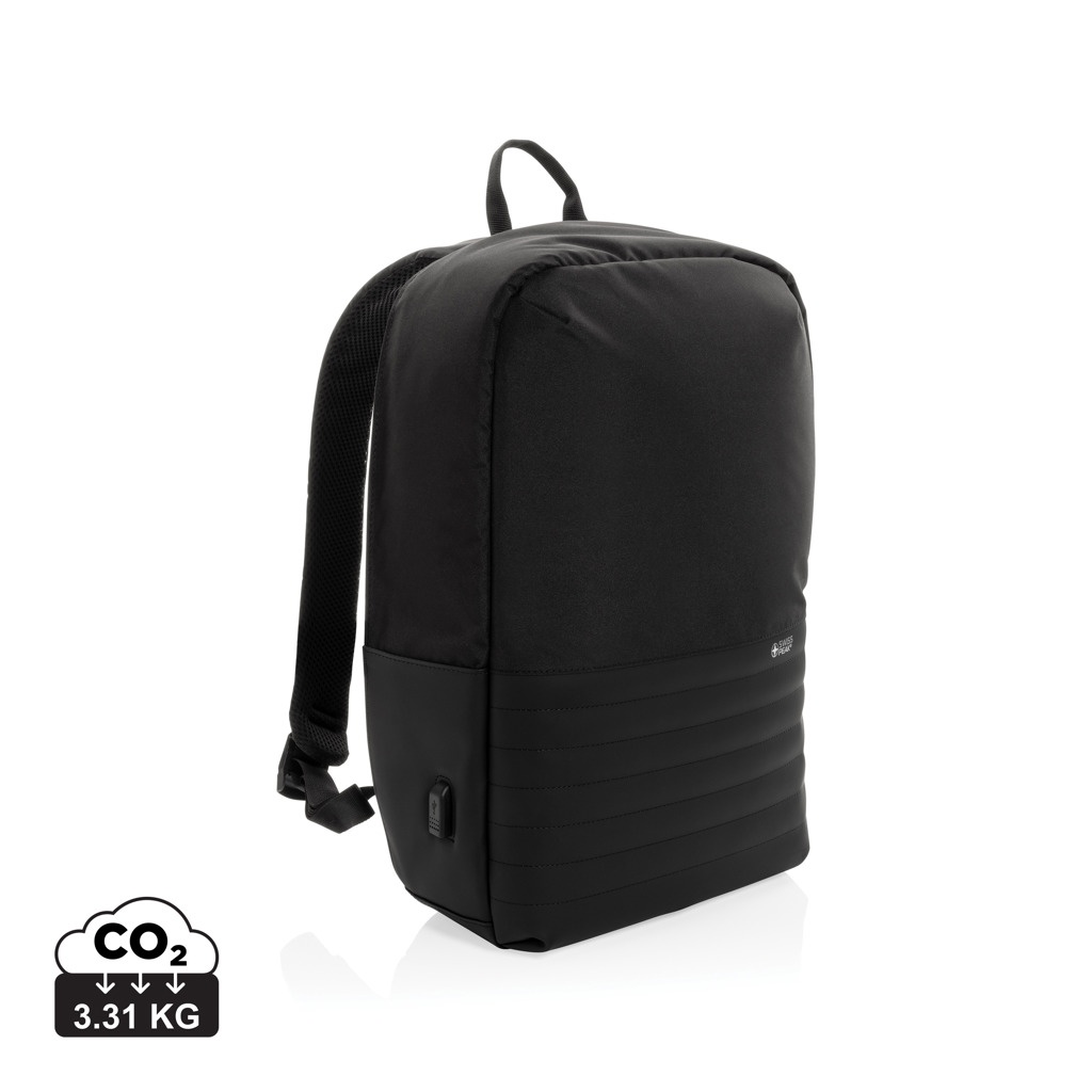 This Swiss Peak AWARE™ 15.6" laptop backpack with anti-theft back opening makes it easy to carry your tech gadgets and personal items out and about. The inner features a laptop and tablet compartment. RFID safe pockets for your wallet and passport. Connect your power bank easily to the integrated USB Type-C charging port and charge your phone or tablet on the go. Hidden easy access back pocket. With AWARE™ tracer that validates the genuine use of recycled materials. Each bag has reused 20.8 PET bottles. 2% of proceeds of each Aware™ product sold will be donated to Water.org.