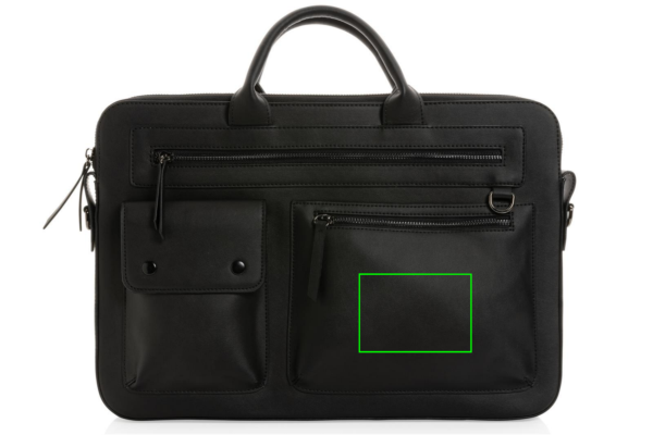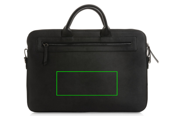 The Swiss Peak GRS recycled PU 14 inch laptop bag breathes modern luxury with a smooth finish in a rich black hue. Includes a detachable strap with dark coloured hardware and two front zipped compartments. Made with GRS certified recycled materials. Made from 100% GRS certified PU. GRS certification ensures a completely certified supply chain of the recycled materials. Total recycled content: 61% based on total item weight. PVC free.