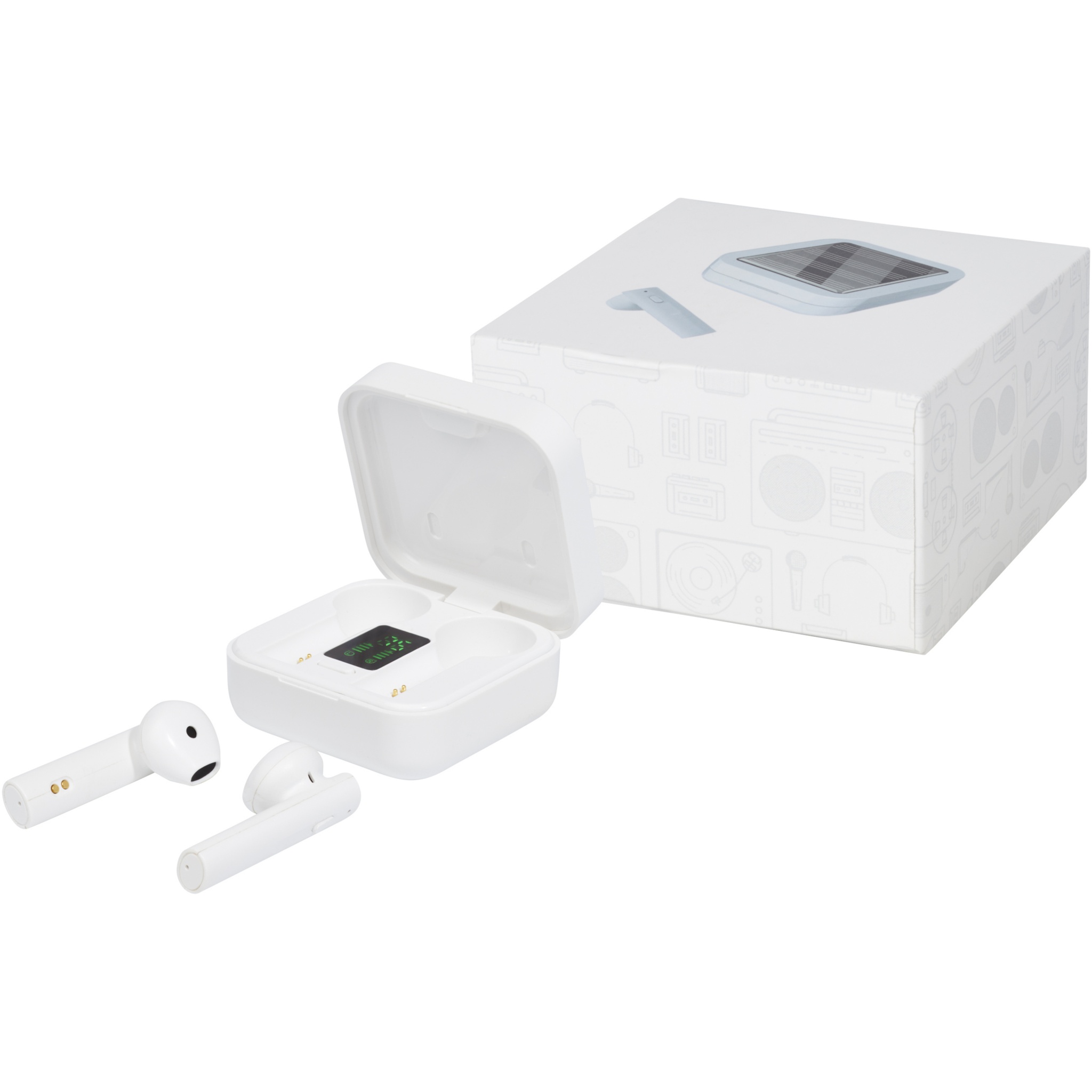 Stylish TWS (True Wireless Stereo) earbuds with an efficient solar panel integrated on the charging case. Ideal earbuds for outdoor activites since they can be charged by solar power when power sources are not available. Bluetooth® 5.0 for a stable connection and low power consumption, with a connection range up to 10 meters. Playback time up to 3 hours at maximum volume. The 200mAh rechargeable polymer battery in the charging case can charge the earbuds from 0-100% up to 3 times. Ergonomic design and comfortable to wear, with an integrated multi-function button on the earpiece for shortcut control. Delivered in a premium gift box.