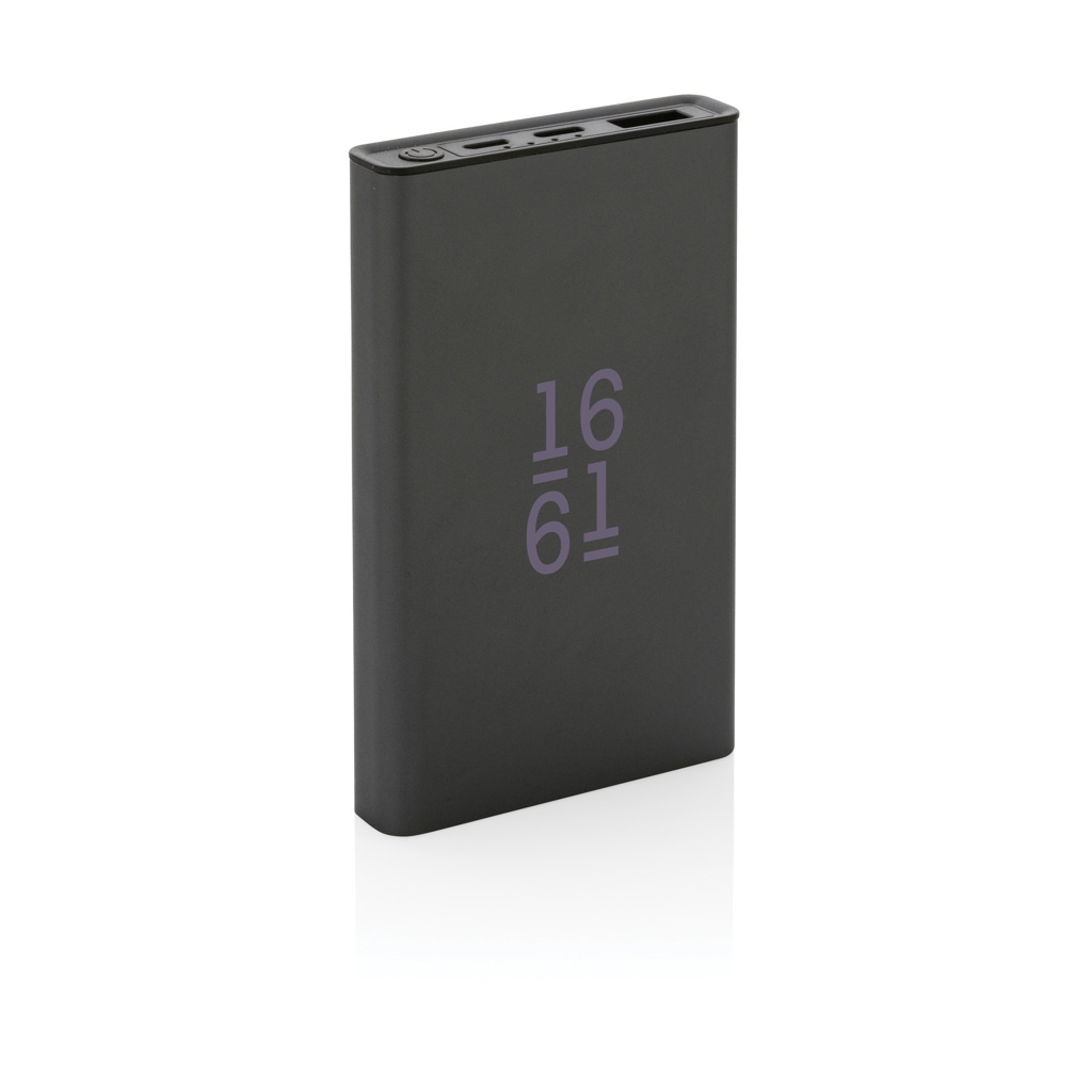 Powerbank made with RCS (Recycled Claim Standard) certified recycled aluminium and ABS. Total recycled content: 36% based on total item weight. RCS certification ensures a completely certified supply chain of the recycled materials. Aluminium does not lose its characteristics in the recycling process and can be recycled endlessly. The powerbank contains a long-lasting grade A 5.000 mAh lithium polymer battery. The power indicators will indicate the remaining energy level so you always know when to re-charge. Item and accessories 100% PVC free. Including type C charging cable made from RCS certified recycled aluminium, TPE and PET. Packed in FSC® mix packaging. USB output 5/2.4A, Type C output: 5V/2.4A. Type C input: 2.4A. Micro USB input: 5V/2A.