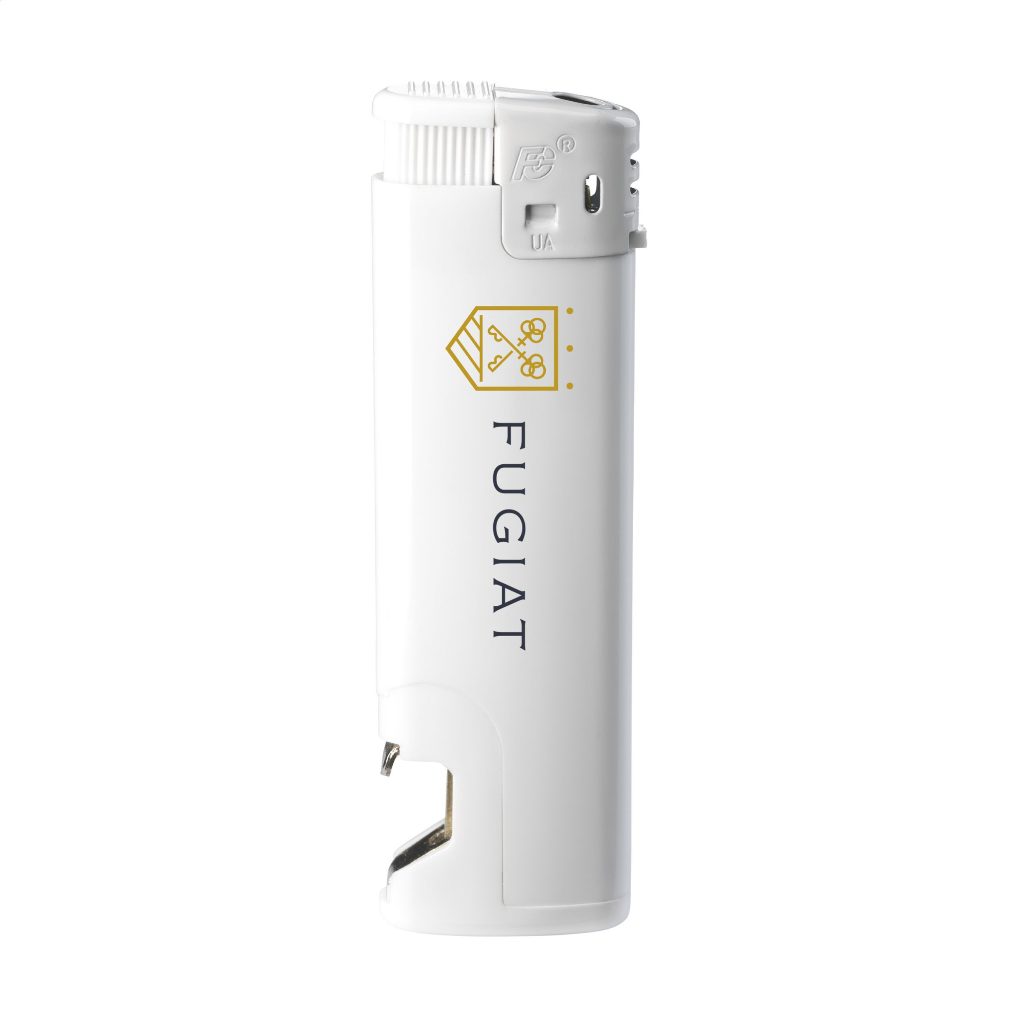 Slim electronic lighter of the brand Flameclub® with a handy bottle opener and adjustable flame. Refillable. Equipped with child lock. NEN-certified: EN13869. TÜV-certified and ISO-certified: ISO9994. Lighter are only supplied with print.