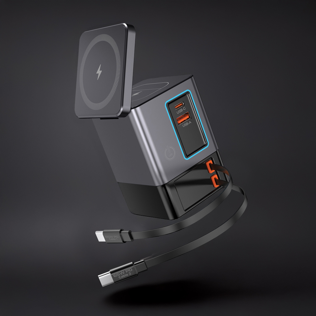 The all-in-one power solution you’ve been waiting for. Sacramento is a 105W GaN charging station that combines maximum power with built-in convenience. It features two integrated retractable 65W USB-C cables, so you always have fast charging at your fingertips — no extra cables needed. Need more options? Sacramento also includes a USB-A and USB-C port, giving you a total of four output options to charge laptops, tablets, smartphones, and more — all at once. And for your wireless devices, Sacramento is equipped with a powerful 15W magnetic wireless charger that keeps your phone securely in place, plus a separate wireless pad designed specifically for smaller items like earbuds or AirPods (5W max).Sacramento delivers high performance with a compact, efficient design — producing less heat and using energy more efficiently than traditional chargers. Sacramento is made with RCS (Recycled Claim Standard) certified recycled fireproof PC. Total recycled content: 26% based on total item weight.