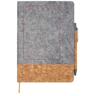 The A5 hard cover notebook is made of cork and recycled felt and has 80 lined sheets of 70 g/m² paper, an elastic closure, ribbon marker, and a pen loop. The button, clip and tip of the ballpoint pen is made of recycled plastic, and the barrel is made of cork. Pen ink: Black. Writing length: 600 metres. Nib size: 1.0 mm.
