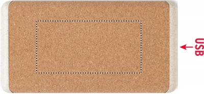 10W wireless charging and 10.000 mAh power bank with cork casing and ABS- wheat straw details. Supports quick charging technology (20W). In/Output: Type-C. Cork is 100% natural material. Due to its structural nature and surface porosity the final print result per item may have deviations. Power delivery (PD) support to charge the newest laptop MacPro®.