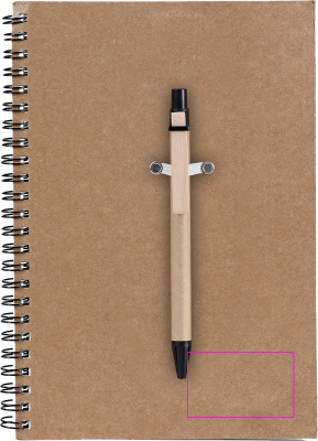 Taaskasutatud papist ja paberist A5 kirjutusplokk 120 joonelise lehega ning taaskasutatud papist sinise tindiga pastakas. Trükime teie logo kaanele.