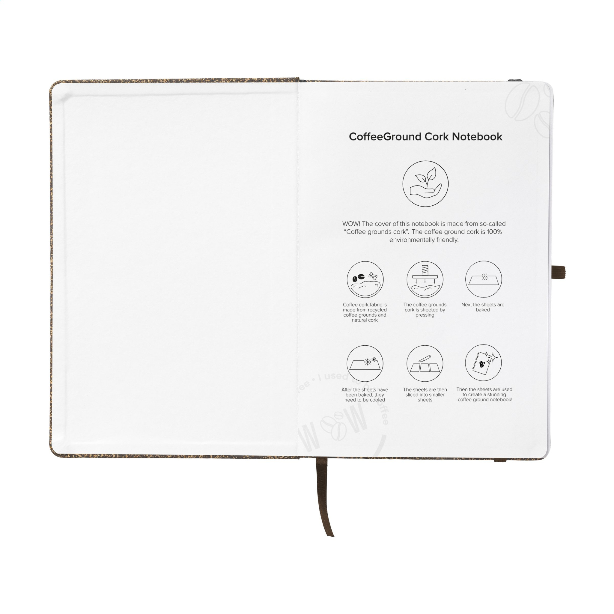 Vau! Märkmik A5 formaadis. Tugev FSC Mix sertifikaadiga pappkate on kaetud jahvatatud kohvi, korgi, polüestri ja puuvilla seguga. Tulemuseks on erinevates pruunides toonides jahe kate, millel on loomulik välimus. Märkmikus on u. 96 lehte/192 lehekülge valget, joonitud, taaskasutatud FSC Mix sertifikaadiga paberit (70 g/m²). Pliiatsi aasa, elastse kinniti ja siidipaelaga. Jahvatatud kohvi kasutamine uute materjalide, nagu see kate, tootmisel pikendab kohviubade elutsüklit. Orgaaniliste materjalide kasutamise tõttu võib kaane värv sülearvuti/partii lõikes veidi erineda.