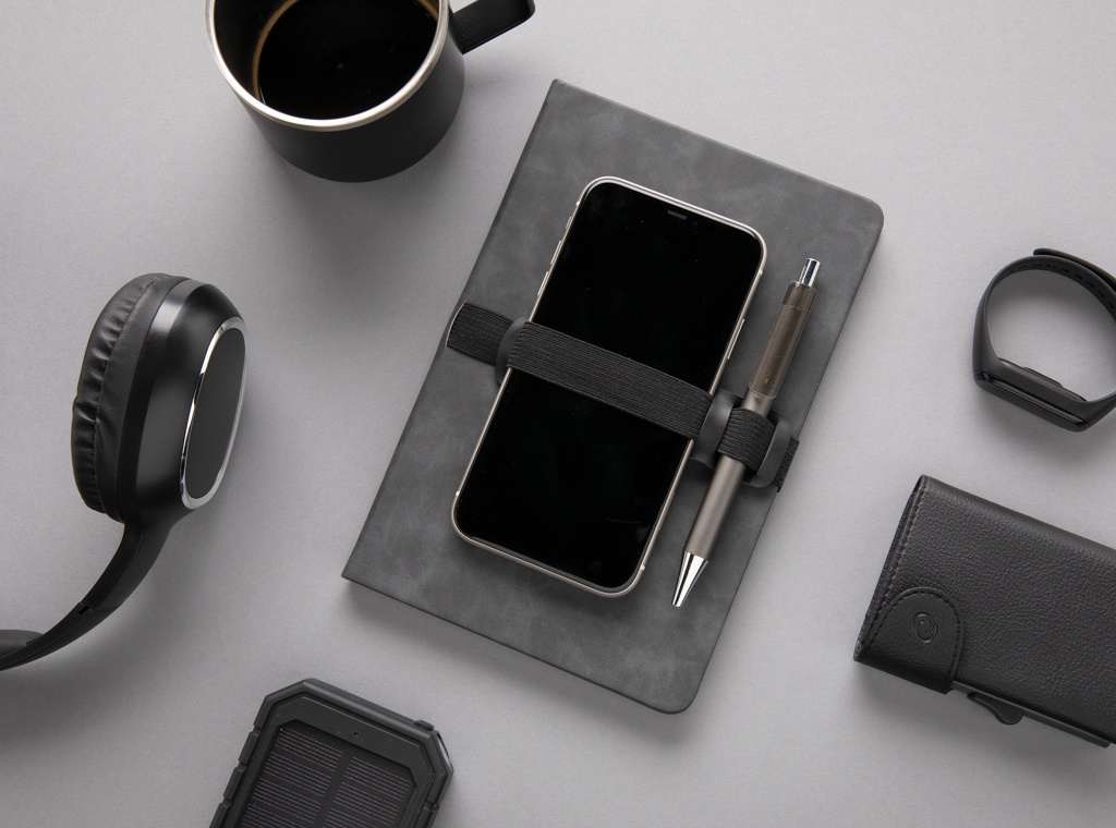 Logo trade firmakingid foto: Deluxe kõvakaaneline PU-märkmik A5 telefoni ja pliiatsihoidjaga