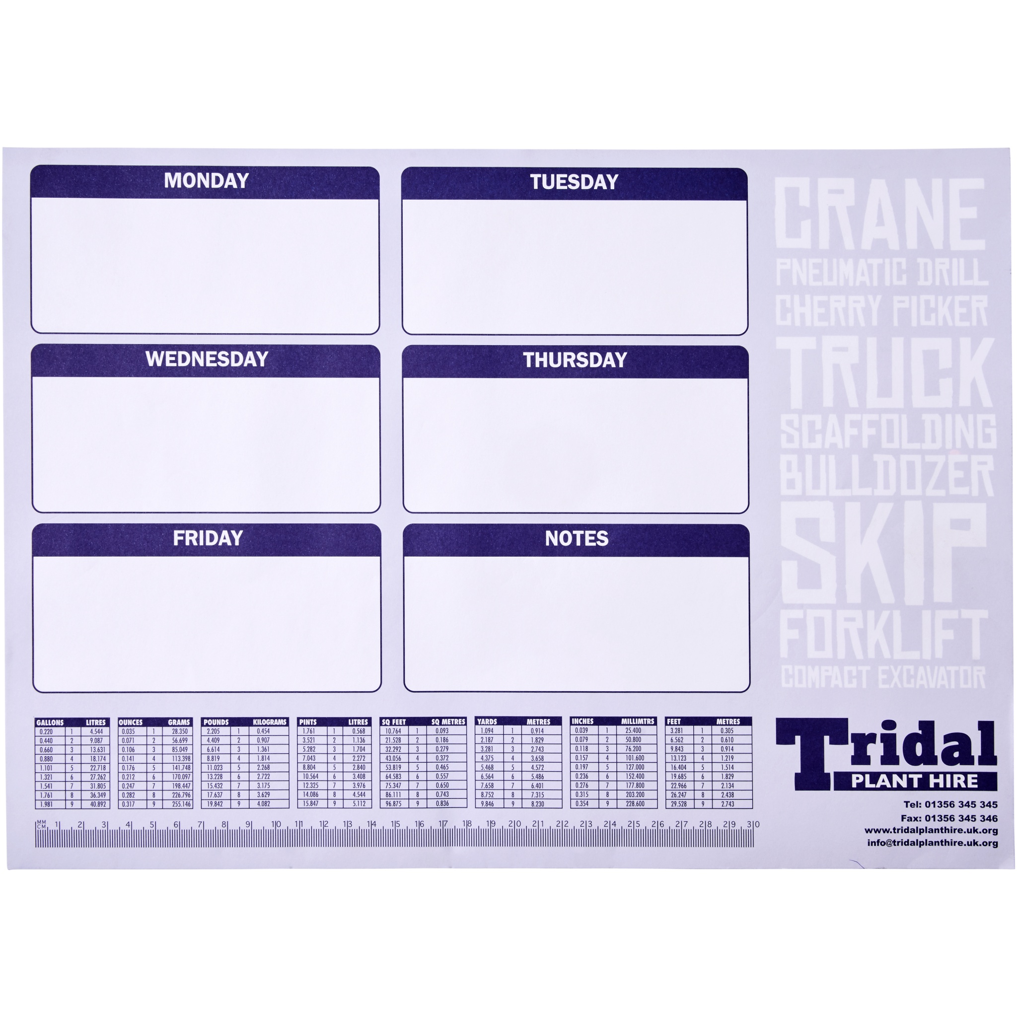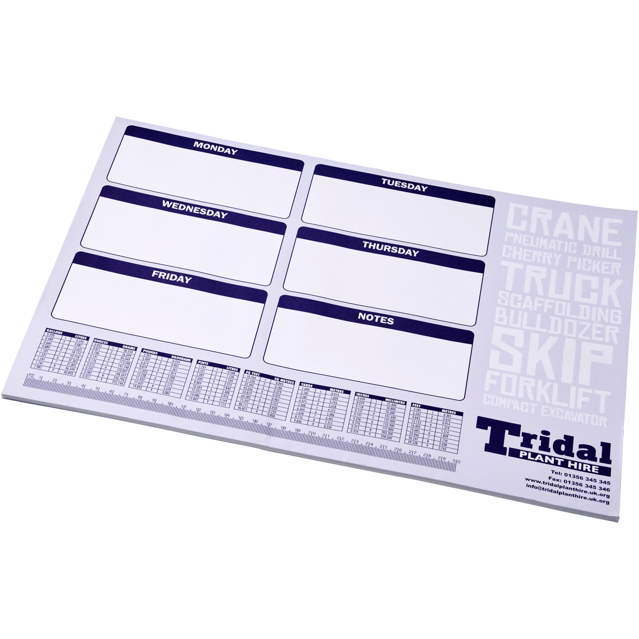 Valge A2 Desk-Mate® märkmik 80 g/m2 paberiga. Igale lehele on saadaval täisvärvitrükk. Saadaval 2 suuruses (25/50 lehte).