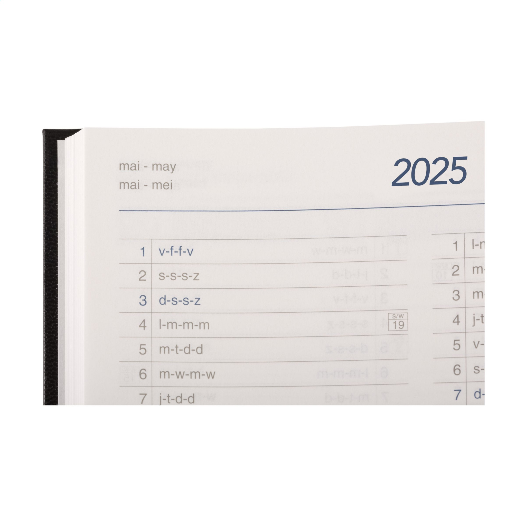Neljakeelne kontoripäevik: EN, NL, F ja D. Vastupidava polsterdatud Balacron kaanega ja aastaarvuga esiküljel. 80 g valget, FSC Mix sertifitseeritud paber, suur nädalaülevaade kahel leheküljel, 2 värvitrüki, niitidega köidetud, nädalaülevaade kahel lehel, aastaplaneerija käesolev ja järgmine aasta, ekstra kasulik teave. Ligikaudu A5 suurus.
