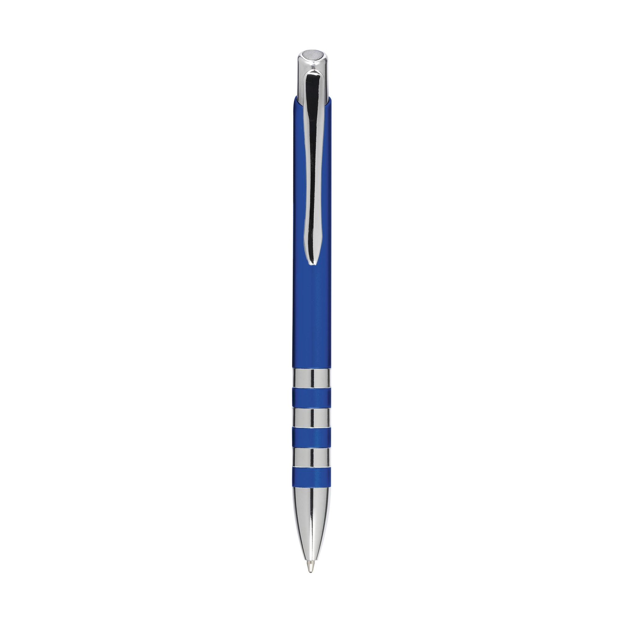 Sinise tindiga pastapliiats metallilise välimusega silindri, metallklambri, nupu ja läikivate silindrirõngastega.
