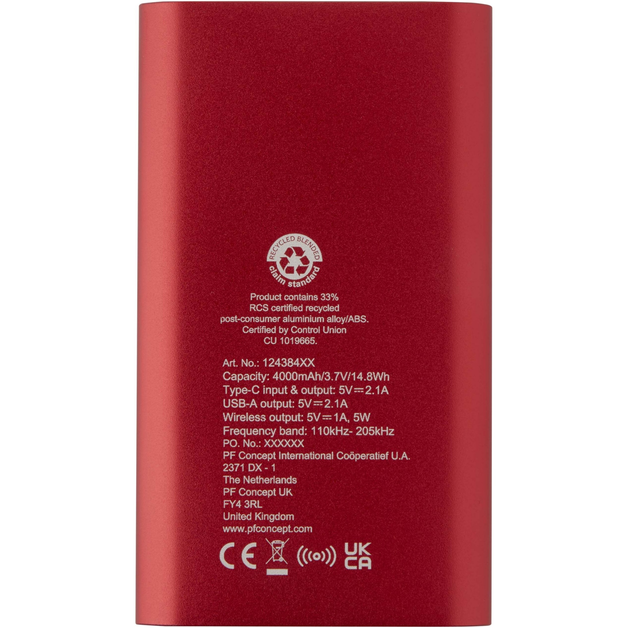 Juice 4000 mAh Type-C taaskasutatud alumiiniumist juhtmevaba toitepank , Punane