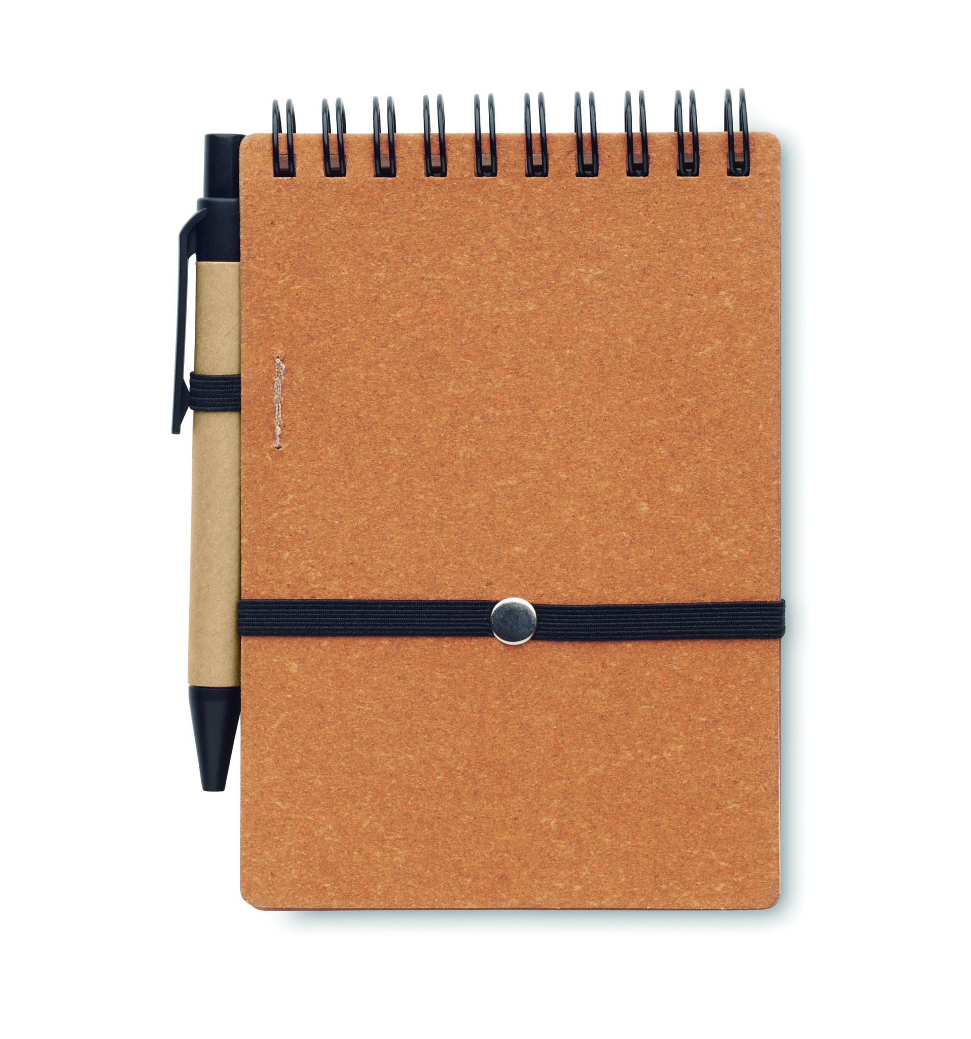 Ümbertöödeldud paberist ja PU (70% taaskasutatud paber ja 30% PU) märkmik. 140 joonega taaskasutatud paberilehte (70 lehte). Nupuga ABS-pastapliiats. Sinine tint. Kummipaela ja pliiatsihoidjaga.