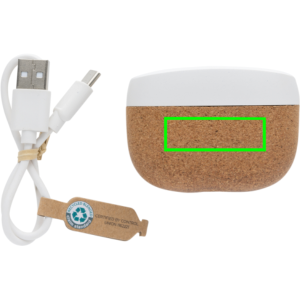 Elegantse disainiga juhtmevabad kõrvaklapid, mis on valmistatud 100% FSC® korgist ja RCS (Recycled Claim Standard) sertifitseeritud taaskasutatud ABS-ist. Taaskasutatud kogusisaldus: 35% eseme kogukaalust. RCS-sertifikaat tagab ringlussevõetud materjalide täielikult sertifitseeritud tarneahela. Täiuslikult sobivatel kõrvaklappidel on 35 mAh aku ja neid saab 300 mAh laadimisümbrises uuesti laadida 1,5 tunni jooksul. Automaatse sidumisfunktsiooniga on nii lihtne mobiilseadmega siduda. Mänguaeg keskmise helitugevusega umbes 3 tundi. BT 5.3-ga optimaalseks ühenduseks. Töökaugus kuni 10 meetrit. Pikari ja mikrofoniga. Kaasas 3 suuruses silikoonist kõrvaotsad. Kaasa arvatud RCS-sertifikaadiga taaskasutatud TPE laadimiskaabel. Pakitud FSC® mix kraft pakendisse. Toode ja tarvikud 100% PVC-vaba.