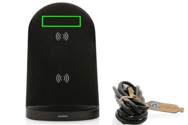 15 W juhtmevaba kiirlaadija alus kahe integreeritud laadimisspiraaliga. Statiiv toetab nii horisontaalset kui ka vertikaalset laadimist. Valmistatud RCS (Recycled Claim Standard) sertifitseeritud taaskasutatud materjalidest. Taaskasutatud kogusisaldus: 56% eseme kogukaalust. RCS-sertifikaat tagab taaskasutatud materjalide täielikult sertifitseeritud tarneahela. Kaasa arvatud 150 cm PVC-vaba taaskasutatud TPE materjalist laadimiskaabel. ; Toode ja tarvikud 100% PVC-vaba. Pakitud FSC segupakendisse. Juhtmeta laadimine ühildub Androidi uusimate põlvkondade, iPhone 8 ja uuemate versioonidega. Sisend: 12V/1,67A. Juhtmeta väljund: 9V/1,5A 15W.
