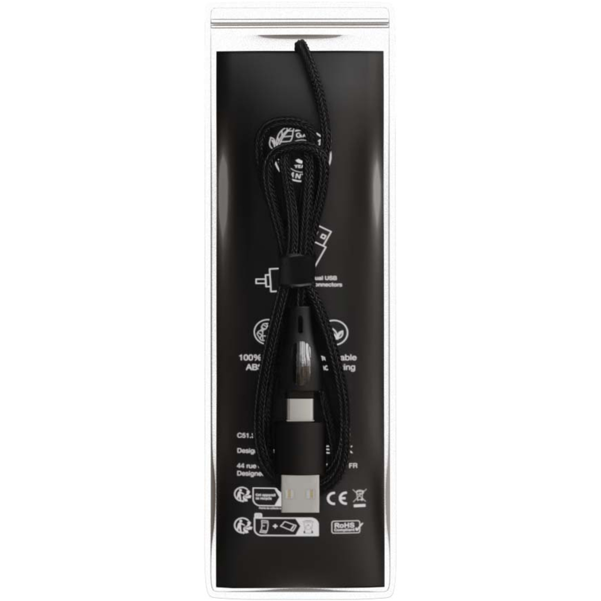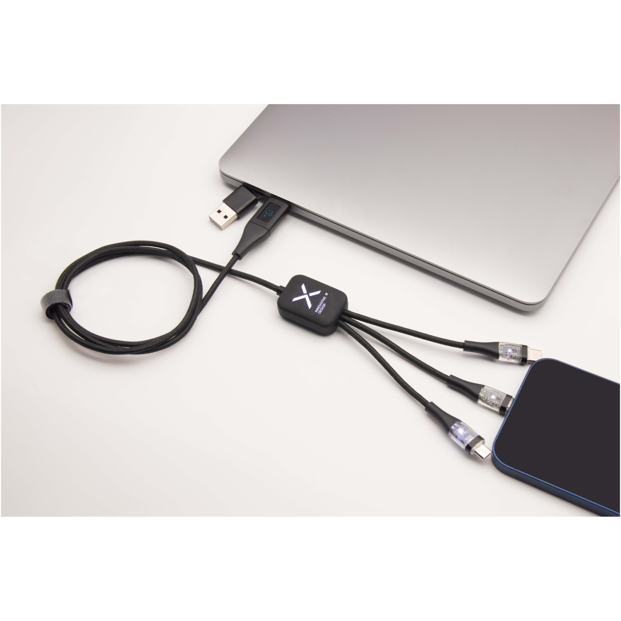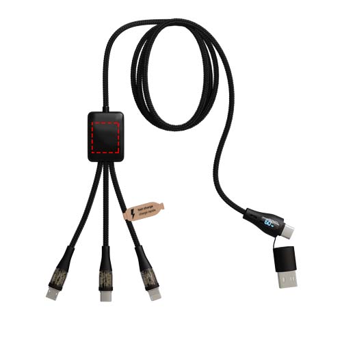 5-ühes 60W taaskasutatud PET-materjalist kiirlaadimiskaabel valgustatud kahepoolse logoga ja kolme pistikuga (Type-C, iPhone ja Android). Kahekordne USB-A + USB-C sisend muudab kaabli 100% ühilduvaks uusimate arvutimudelitega. Kaabliga saab laadida mitut seadet korraga. Tarnitakse taaskasutatava TPU-koti ja taaskasutatud paberist sisetükiga. Juhtme pikkus: 1 meeter.
