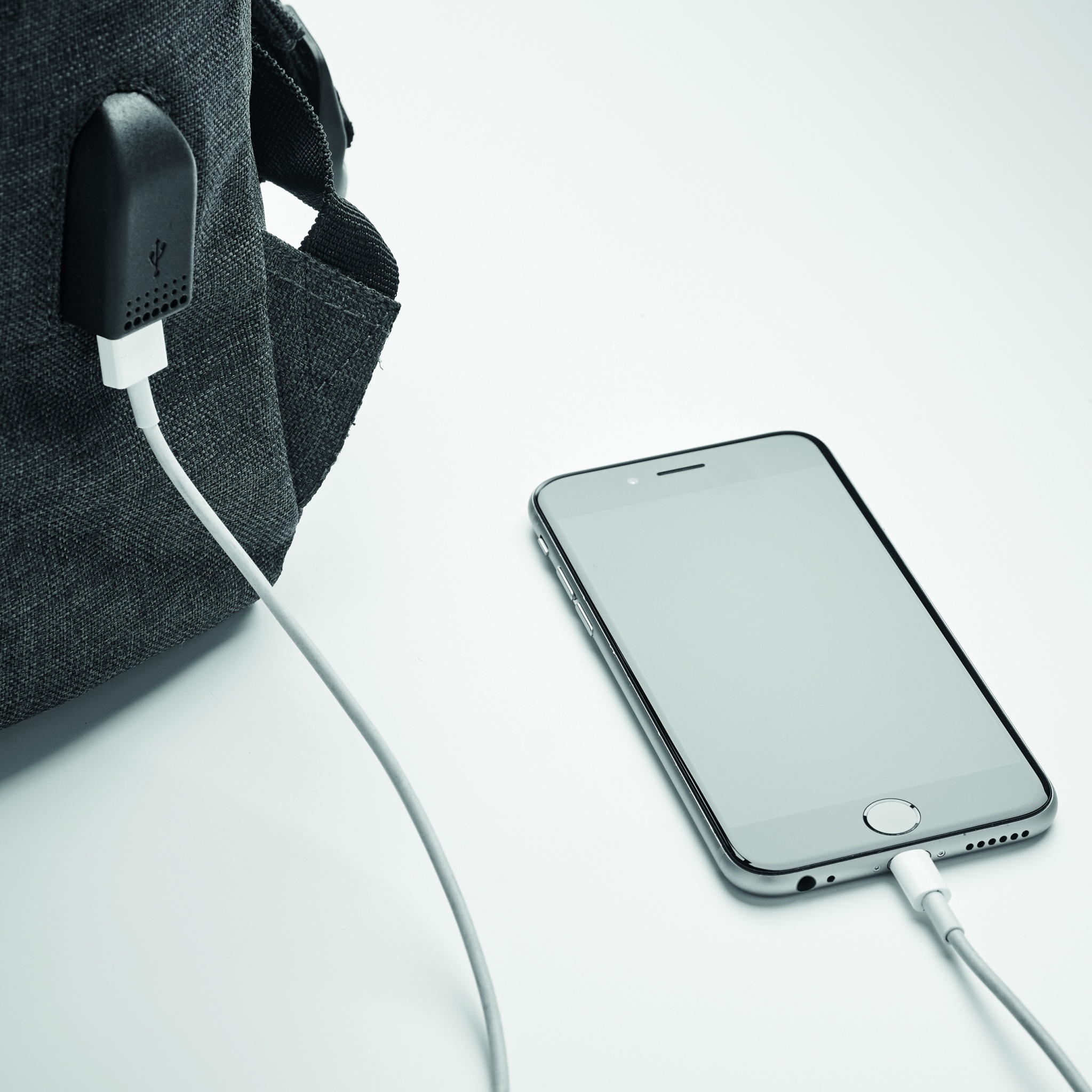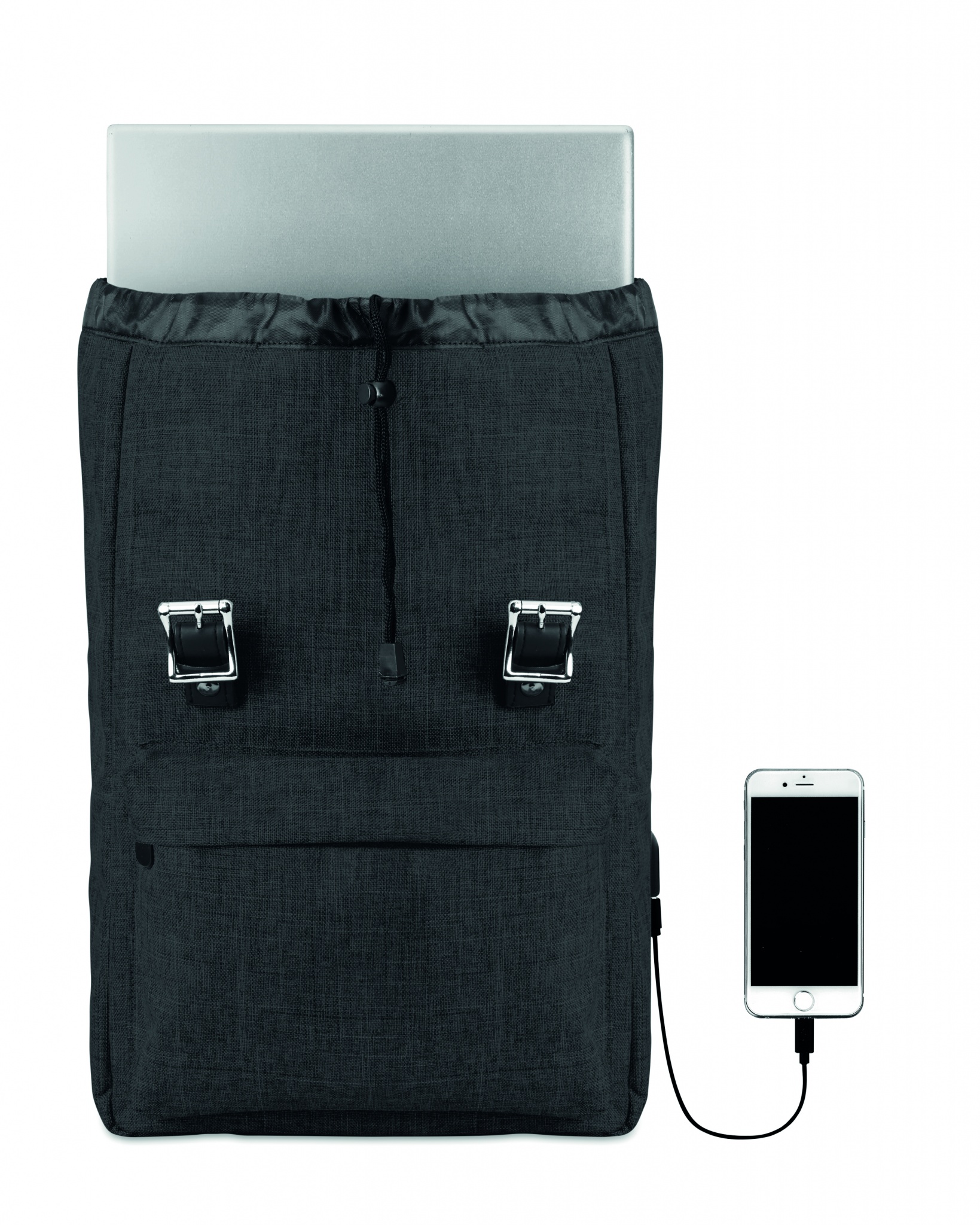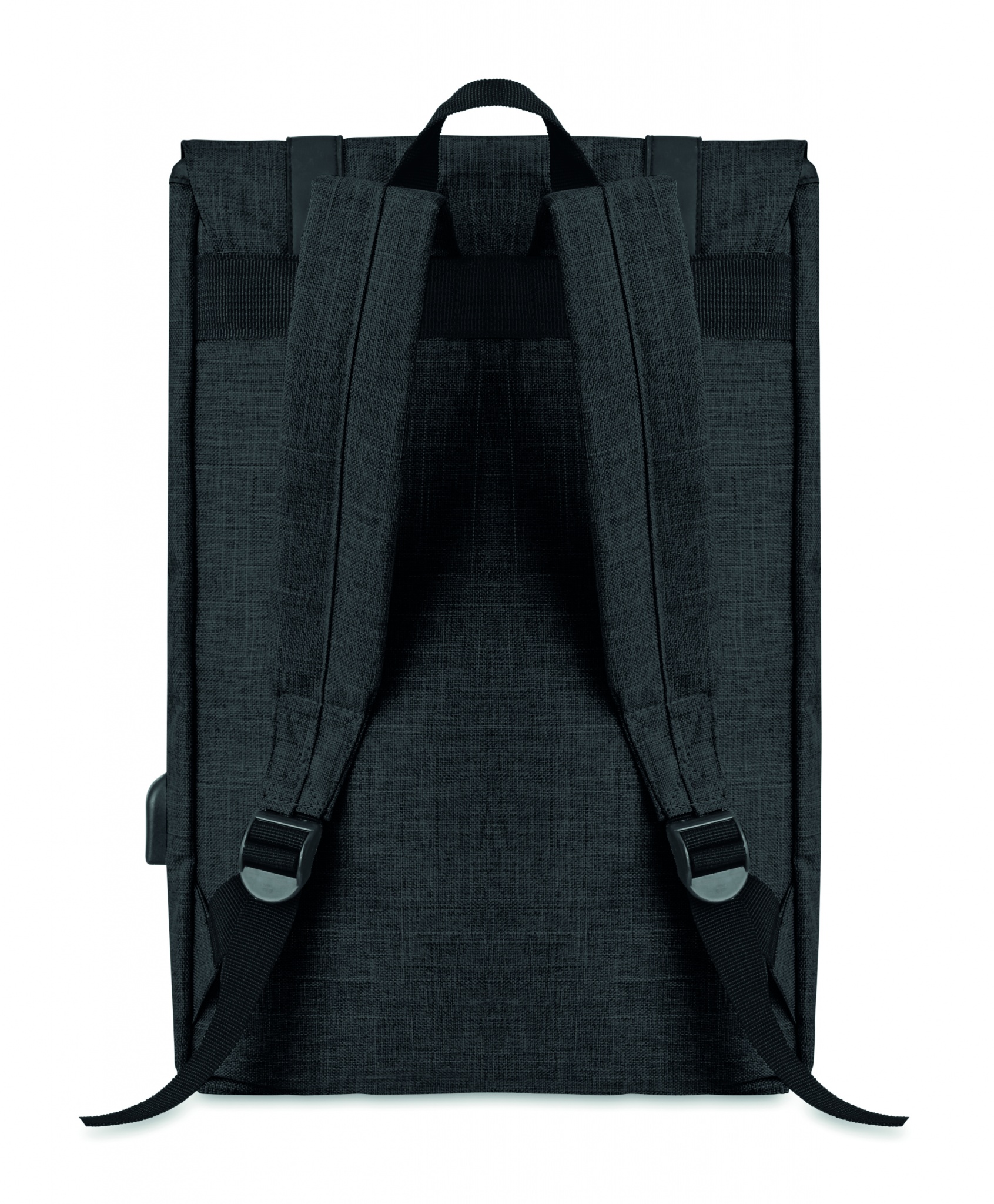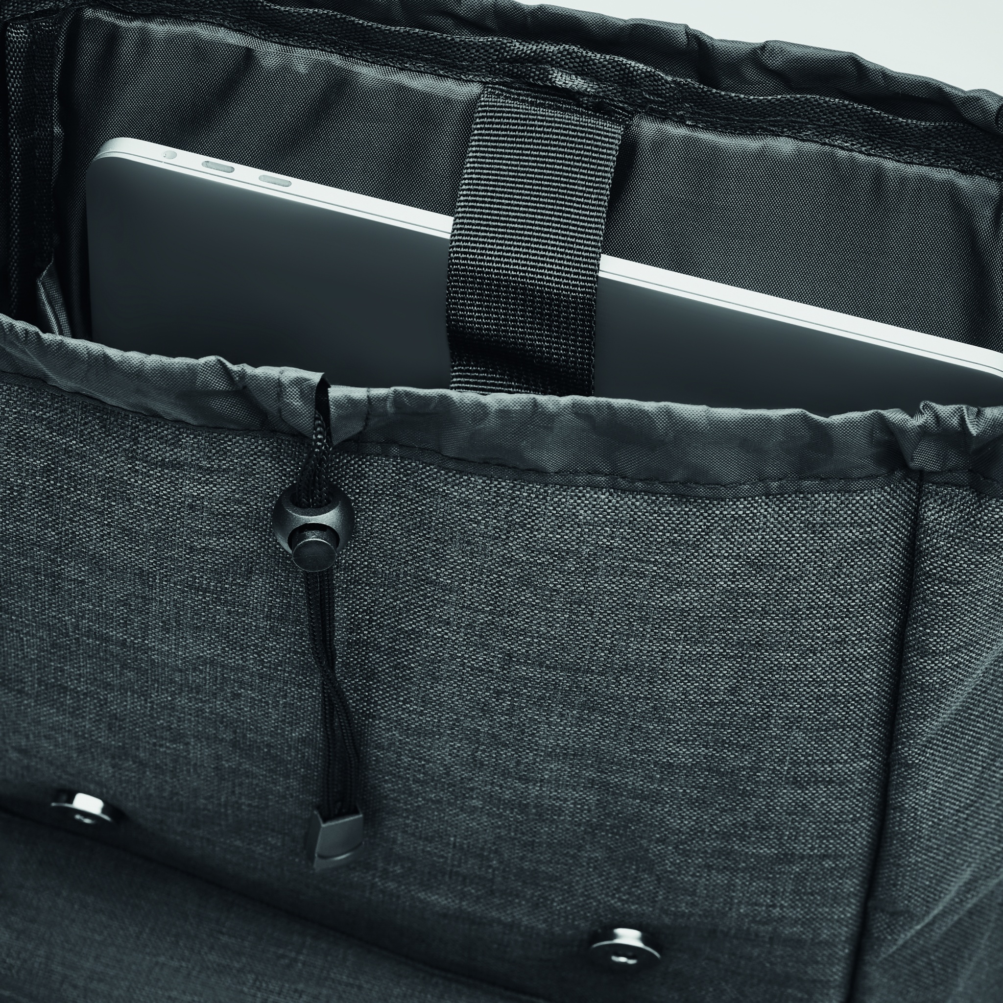 Sülearvuti seljakott 600D 2-toonist polüestrist polsterdatud õlarihmaga, mis sisaldab ühte peamist sisemist sahtlit 15-tollise sülearvuti jaoks ja USB-laadimiskaablit. Kaasas magnetnööbiga kinnis ja üks lukuga esiosa.