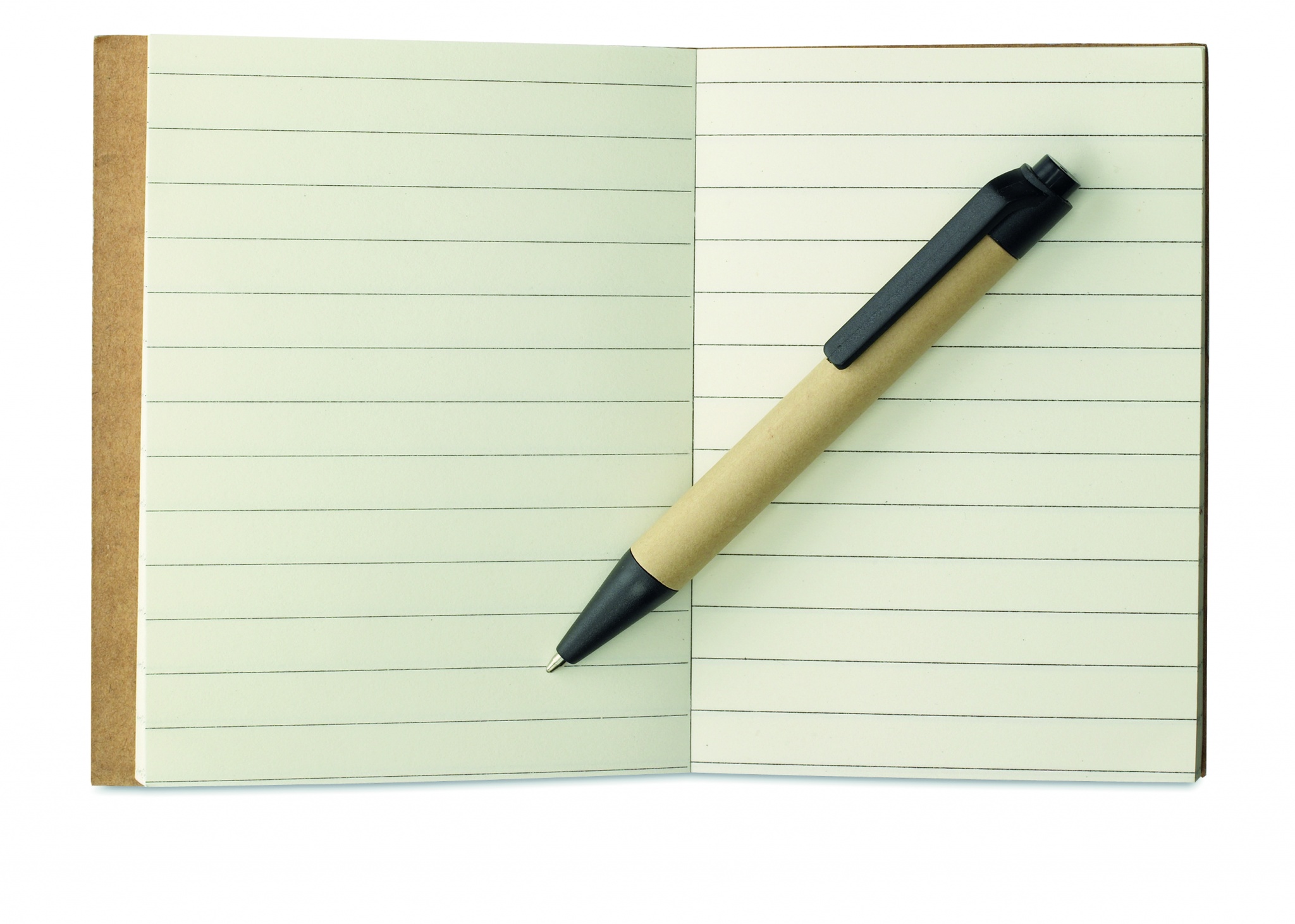 Taaskasutatud paberist märkmik koos sobiva pliiatsiga. Pehmest paberist kate koos pliiatsihoidjaga. Casebound. 160 joonelist lehte (80 lehte). Sobiv nupuga pastapliiats taaskasutatud karbis ja biolagunevas plastis. Sinine tint.