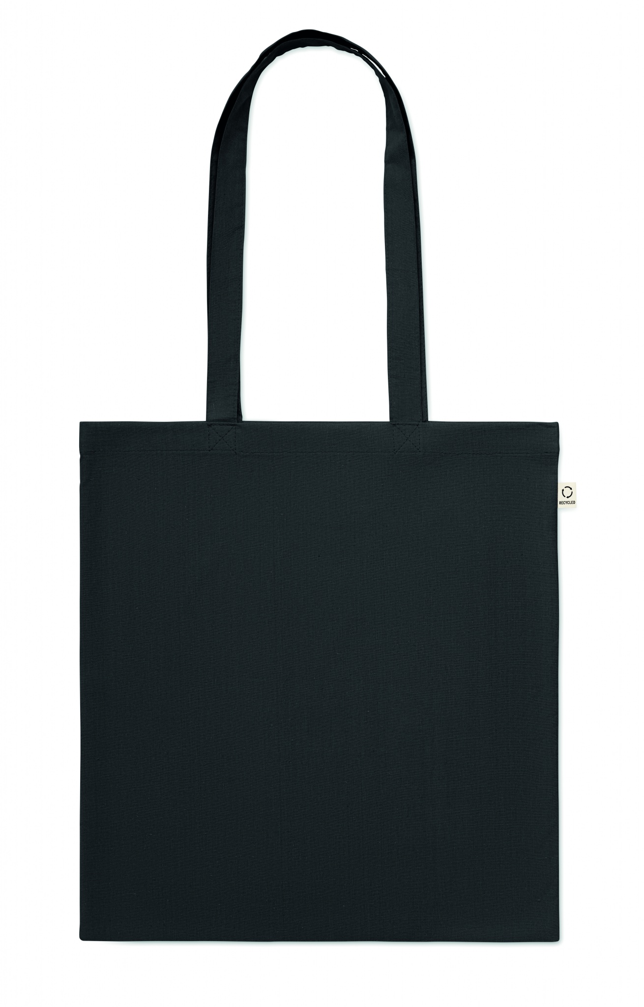 Tarbimiseelsest taaskasutatud puuvillasest ostukott (70% taaskasutatud puuvill ja 30% RPET) pikkade sangadega. 140 gr/m².