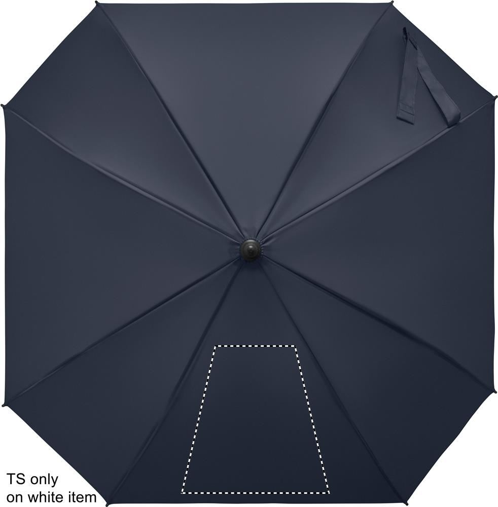 23-tuumainen tuulenpitävä, automaattisesti avautuva neliönmuotoinen sateenvarjo 190T pongee-polyesteriä. Täyslasikuituinen runko ja ruoteet sekä kumipintainen ABS-kahva.