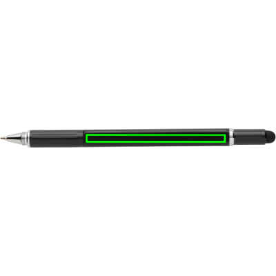 Kynä usealla toiminnolla: viivoitin (7cm), vatupassi, ruuvimeisseli, kosketuskynän pää ja kuulakärkikynä sinisellä musteella (jopa 400m). Tehty korkealaatuisesta messinkimateriaalista alumiiniklipillä.