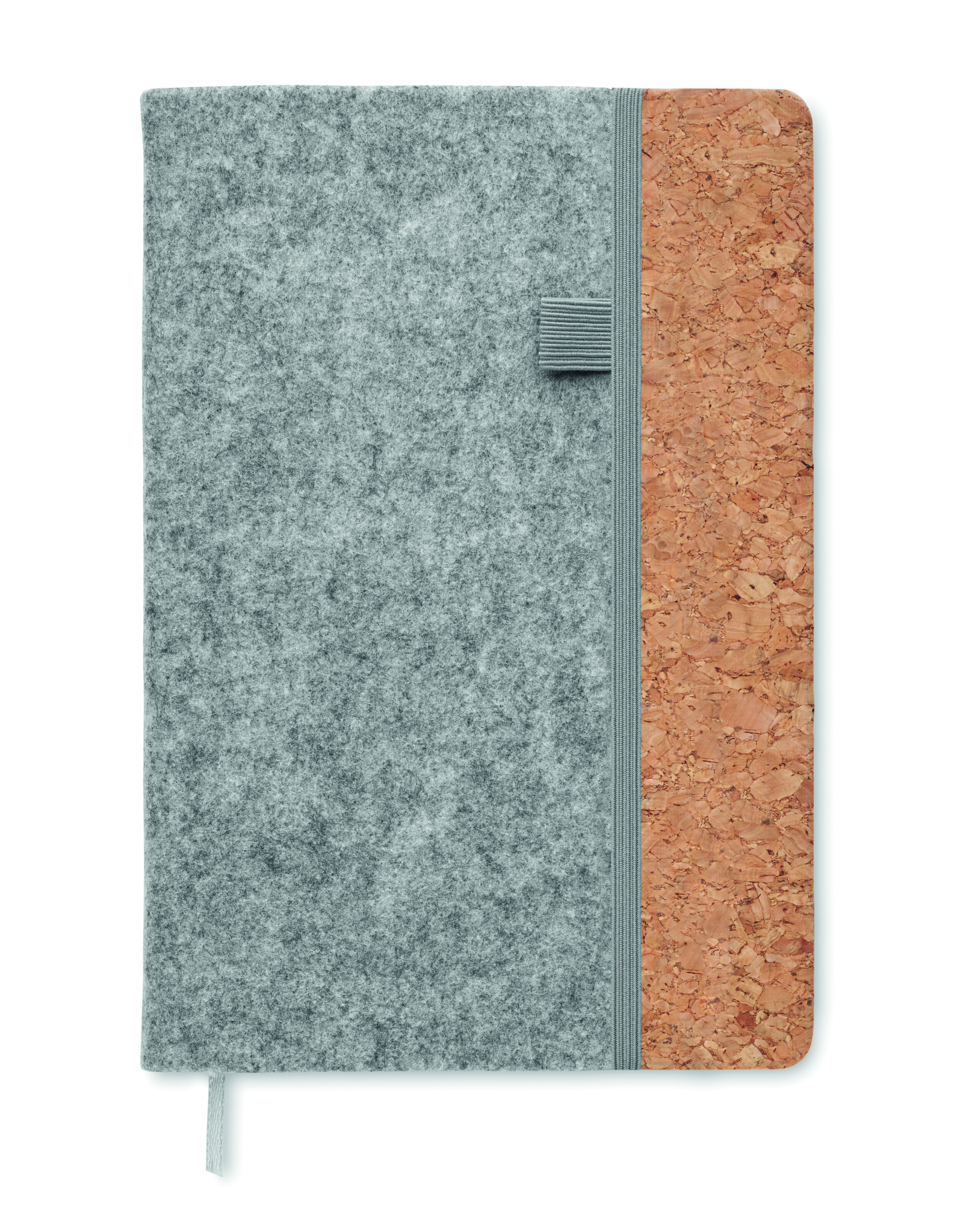 A5-muistivihko RPET-huopakannella ja korkilla. 160 kierrätyspaperilla vuorattua sivua (80 arkkia). Joustava kynälenkki edessä, yhteensopiva joustava suljinnauha ja nauha-sivumerkki.