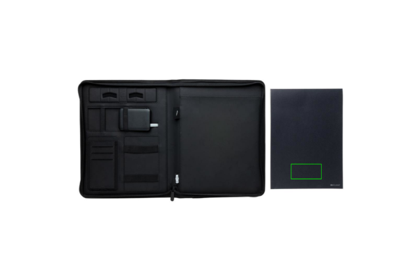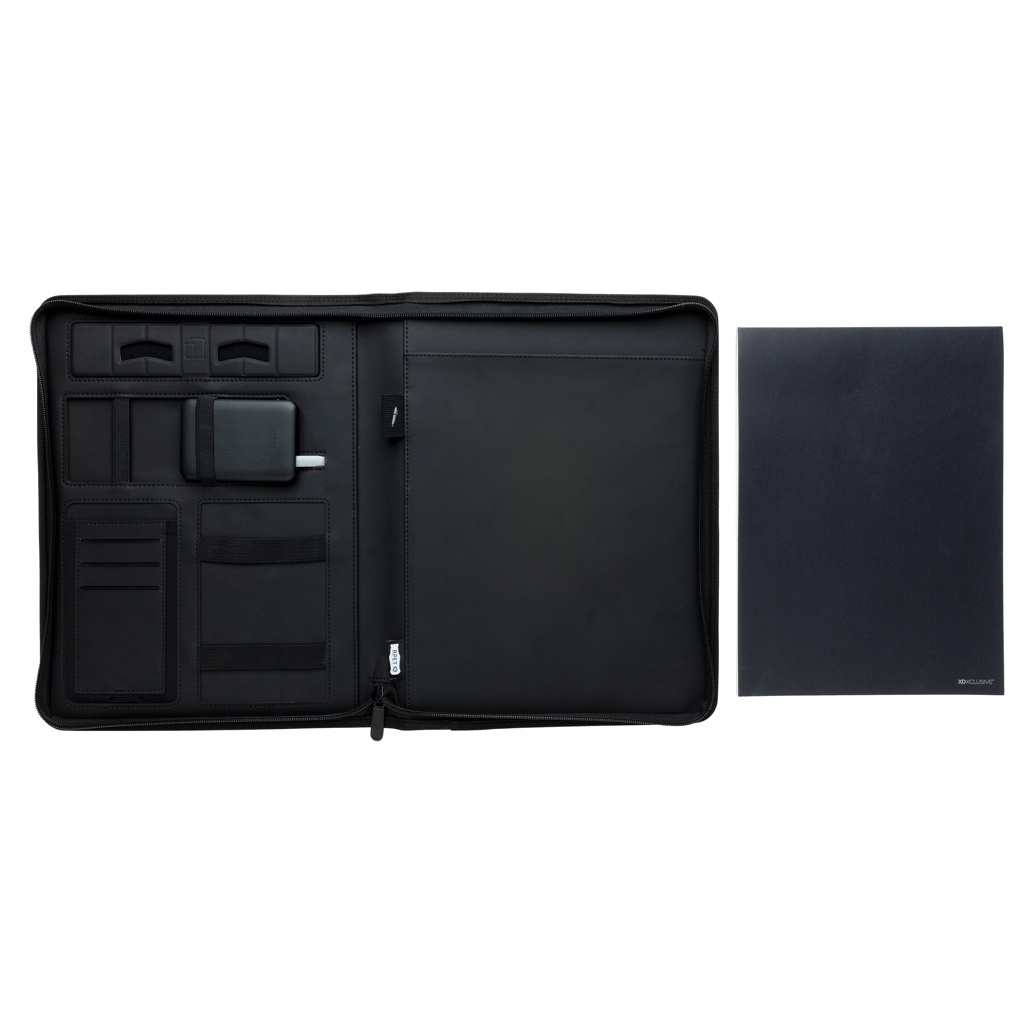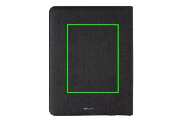 Tämä A4 portfolio, jossa on 20 kermanväristä viivoitettua 70 gramman paperiarkkia muistiona, edustaa uusinta tekniikkaa. Etukannessa on langaton latausalusta puhelintasi varten. (Androidin uusimmat sukupolvet, iPhone 8 ja uudemmat.) Vanhemmat puhelimet ja tabletit voidaan ladata USB-liitäntöjen kautta 5 000 mAh varavirtalähteen avulla. Sisääntulo: 5,0 V/2,1 A. Ulostulo 1: 5,0 V/2,1 A. Ulostulo 2: 5,0 V/2,1 A. Langaton ulostulo: 5W. Rekisteröity malli®