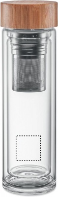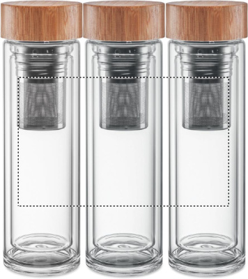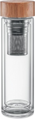Kaksiseinäinen korkea 400 ml borosilikaattilasipullo ja bambukansi teesiivilällä. Luonnollisen materiaalin (bambu) vuoksi, tuotteiden värissä/ koossa saattaa olla erinäisyyksiä ja tämä voi vaikuttaa painatuksen lopputulokseen. Borosilikaattilasiin ei voi kaiverruttaa.