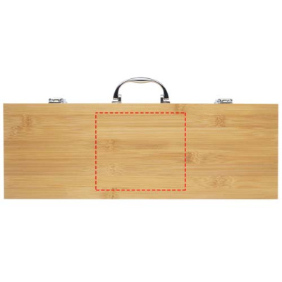 Bambusta valmistettu 5-osainen grillausvälinesetti, jossa on lasta (40 x 9,5 cm), pihdit (34,5 x 6 cm), haarukka (38,5 x 3 cm), veitsi (38,5 x 3 cm) ja harja (38 x 4,3 cm). Setti toimitetaan bambusta valmistetussa lahjapakkauksessa (46 x 16,2 x 7,4 cm). Kahvoissa ja lahjapakkauksessa käytetty bambu on hankittu ja valmistettu kestävien standardien mukaisesti.