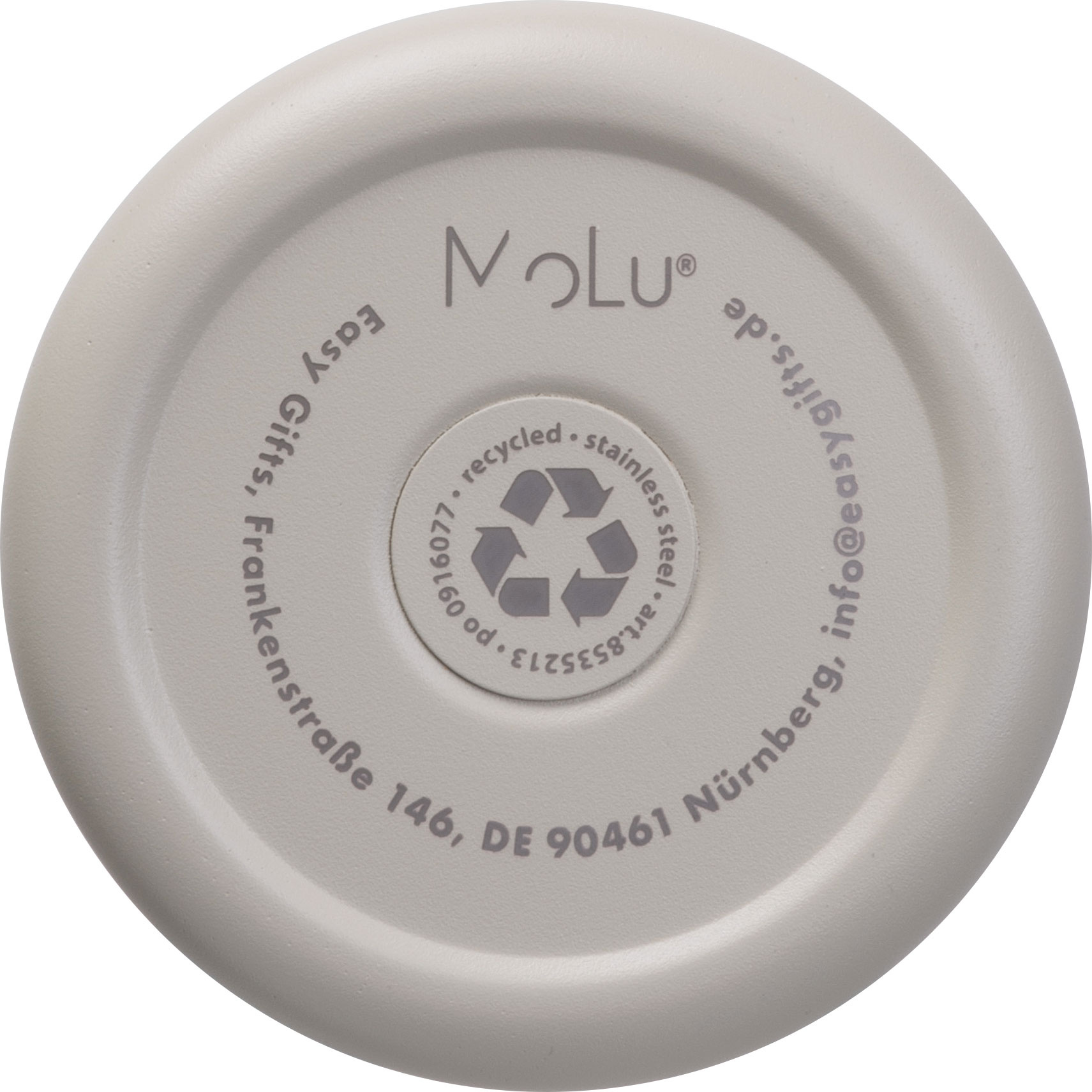 Valmistettu kierrätetystä ruostumattomasta teräksestä, kaksiseinäinen ja kuparieristetty – pitää juomat kuumina tai kylminä jopa 20 tuntia. Muotoiluun integroitu: kaksi kuppia – yksi kannessa, yksi pohjassa. Hienostunut ruskea kahva – ihanteellinen juomiseen, kaatamiseen tai kantamiseen. Huolellisesti suunniteltu, kestävä ja täydellinen mukaan otettavaksi – MoLu fiksuimmillaan.