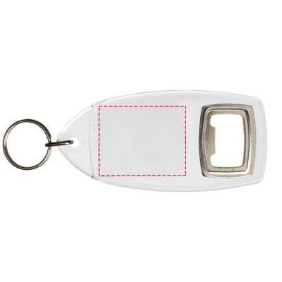 Kirkas R1-avaimenperä, jossa on pullonavaaja ja metallinen avainrengas. Metallirengas tekee profiilista litteän, mikä on ihanteellista postituksen kannalta. Tulosteinsertin mitat: 4,0 cm x 3,2 cm.