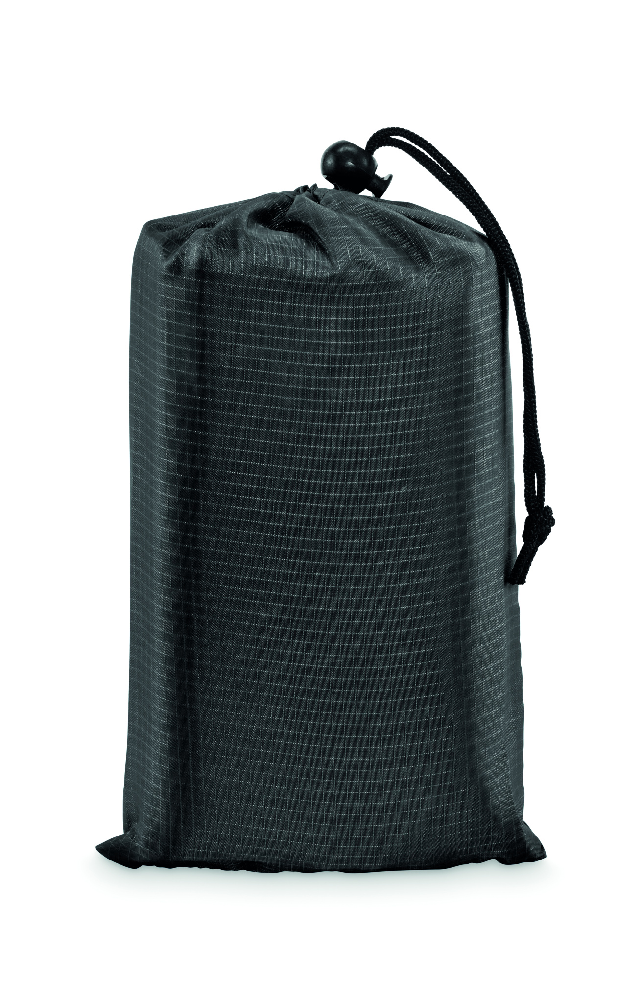 Kevyt rantamatto 210T polyesteristä, mitat 200 x 210 cm. Mukana neljä mustaa koukkua ja yhteensopiva kiristysnyörillä varustettu pussi helppoa kantamista varten.
