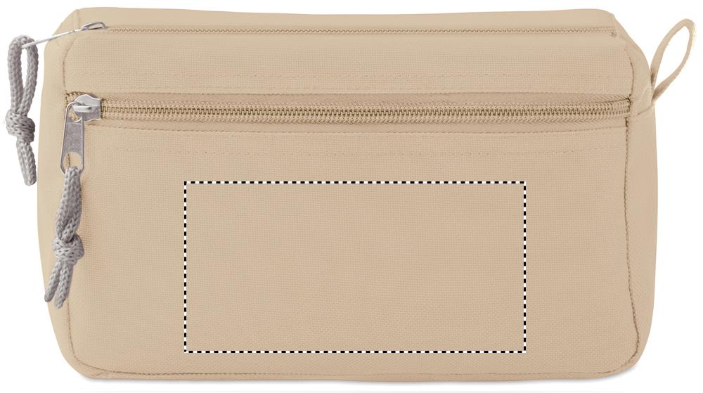 600D- polyesterinen kosmetiikkalaukku PPE-taustalla, kahdella vetoketjullisella taskulla.