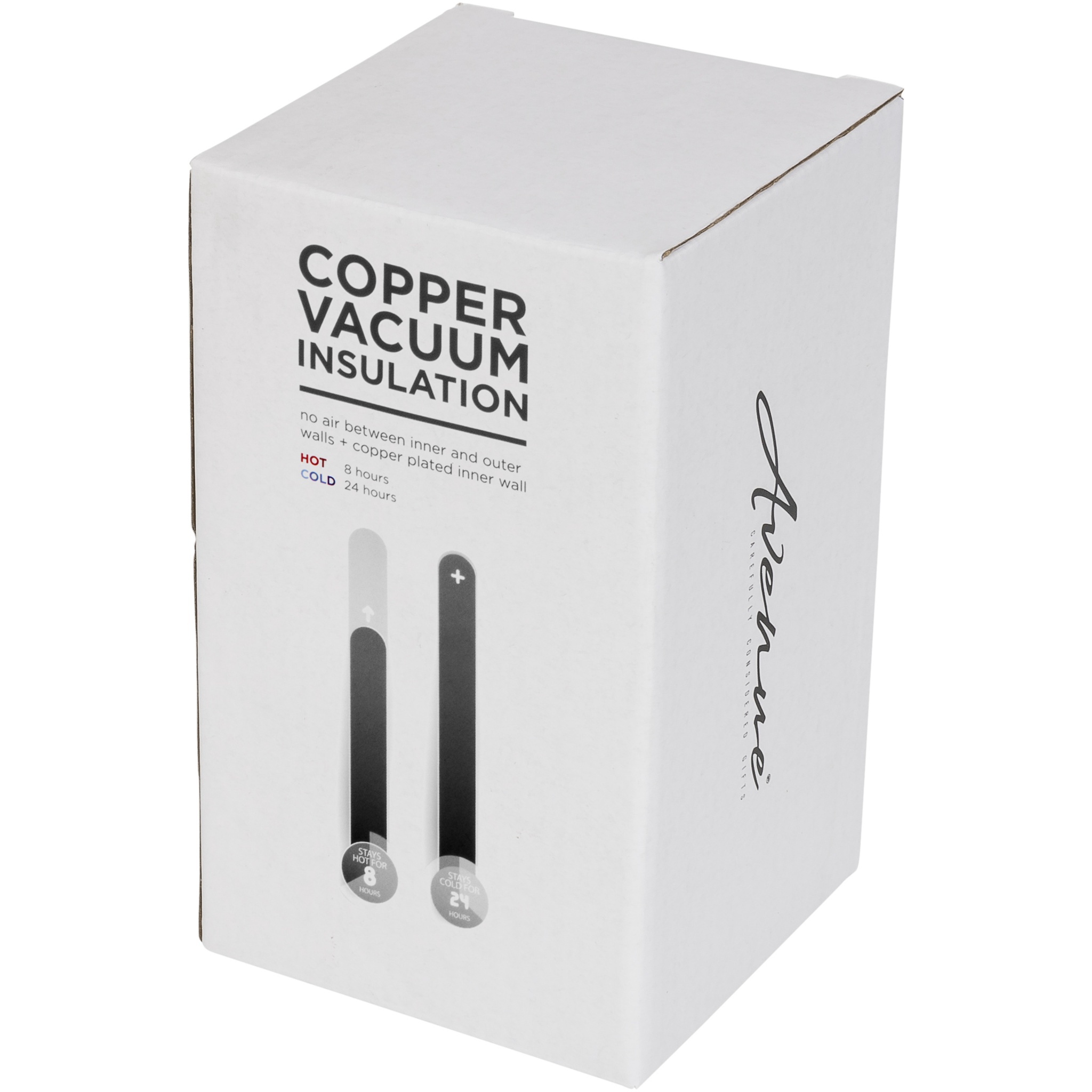 Kestävä, kompakti termospullo matkoille mukaan. Kansi on vuotamaton ja avautuu helposti. Ruostumattomasta teräksestä valmistettu kaksiseinäinen rakenne ja kuparieriste, jotka pitävät juomat kuumana 8 tuntia ja kylmänä 24 tuntia. Rakenne estää myös kondensaation termospullon ulkopuolella. Tilavuus 380 ml. Avenue-lahjakotelossa.