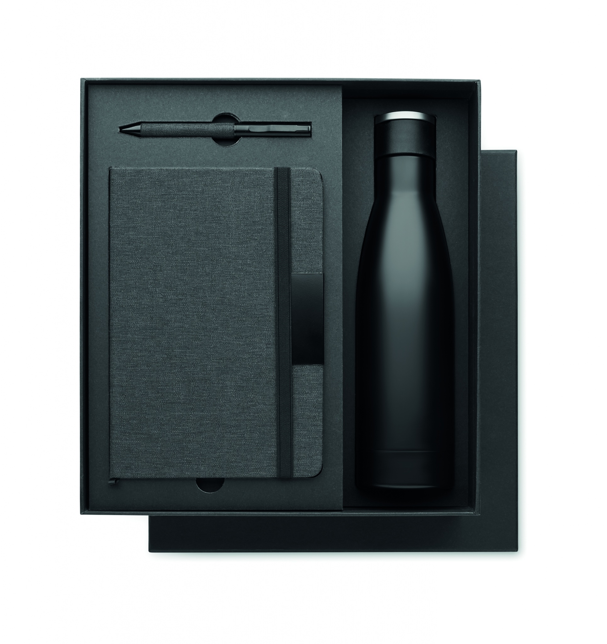 Ylellinen 3-osainen lahjasetti. Se sisältää A5-muistikirjan, jossa on kova RPET-kansi. 160 kierrätyspaperisivua (80 arkkia). sävy sävyyn joustava sulkuhihna sekä nauhallinen sivumerkintä- ja kynäteline. Settiin sopiva kierrettävä kuulakärkikynä. Kaksiseinäinen ruostumattomasta teräksestä valmistettu tyhjiöeristetty pullo. Tilavuus: 500 ml. Ylellisessä lahjapakkauksessa.