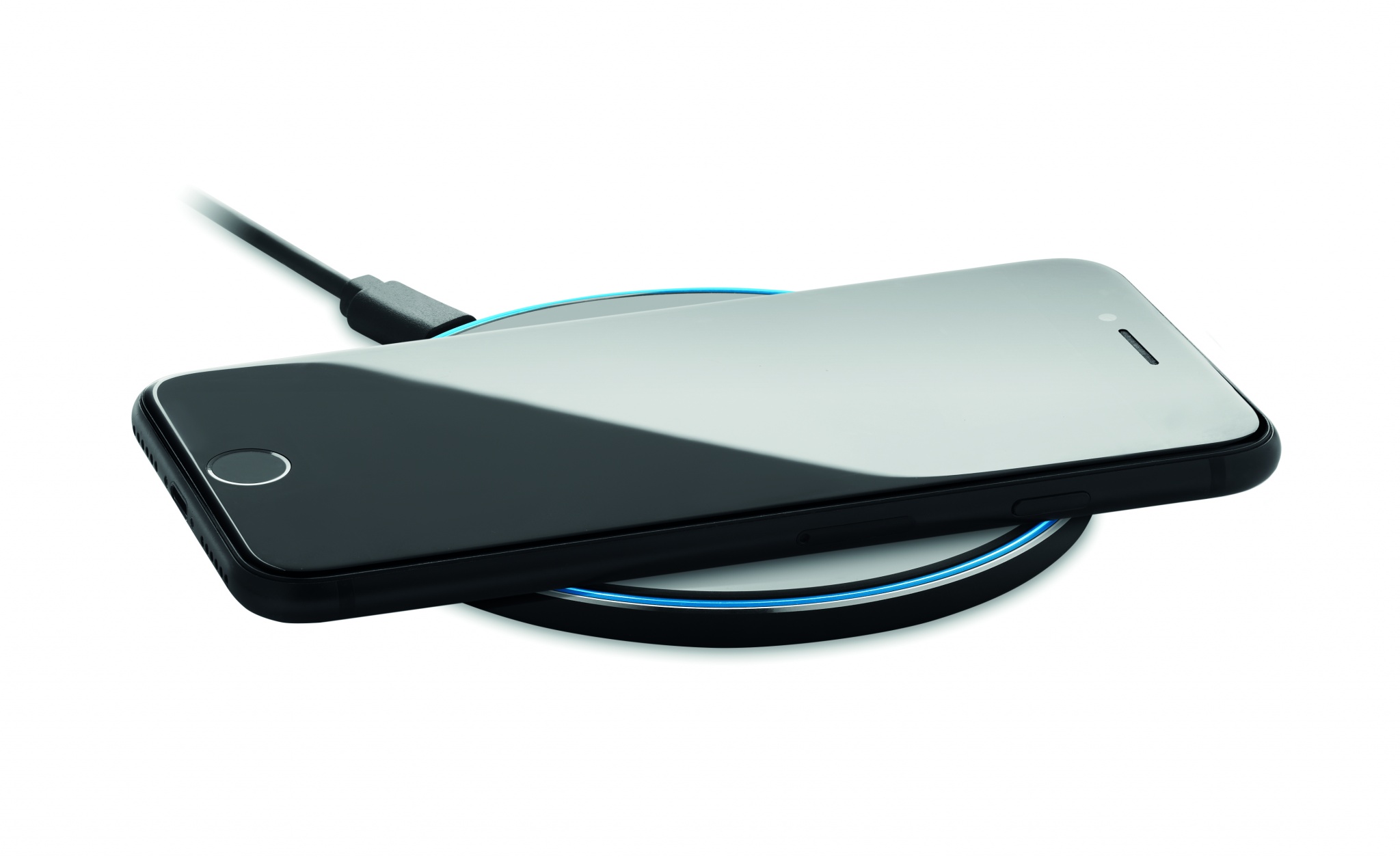 Alumiininen langaton laturi 10W, jonka pinta on lasia. Liitä laite tietokoneeseen, aseta älypuhelin sen päälle ja anna puhelimen latautua. Sininen valo latauksen aikana. Lähtö: DC 9V/1.1A. Yhteensopiva uusimpien androidien, iPhone® 8, X ja uudempien kanssa.
