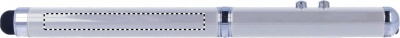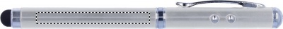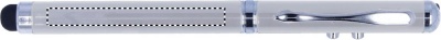 Metallinen laserosoitin valkoinen led valo, punainen laserosoitin ja kosketusnäyttöpää. Sisältää kolme LR41 patteria, pakattuna metallirasiaan.