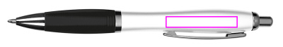 Kuulakärkikynä, jossa valkoinen piippu, metallipidike, sininen kirjoitus iso täyttö ja värillinen pehmeä kosketuskahva. Painamme logosi leikkeen oikealle puolelle.