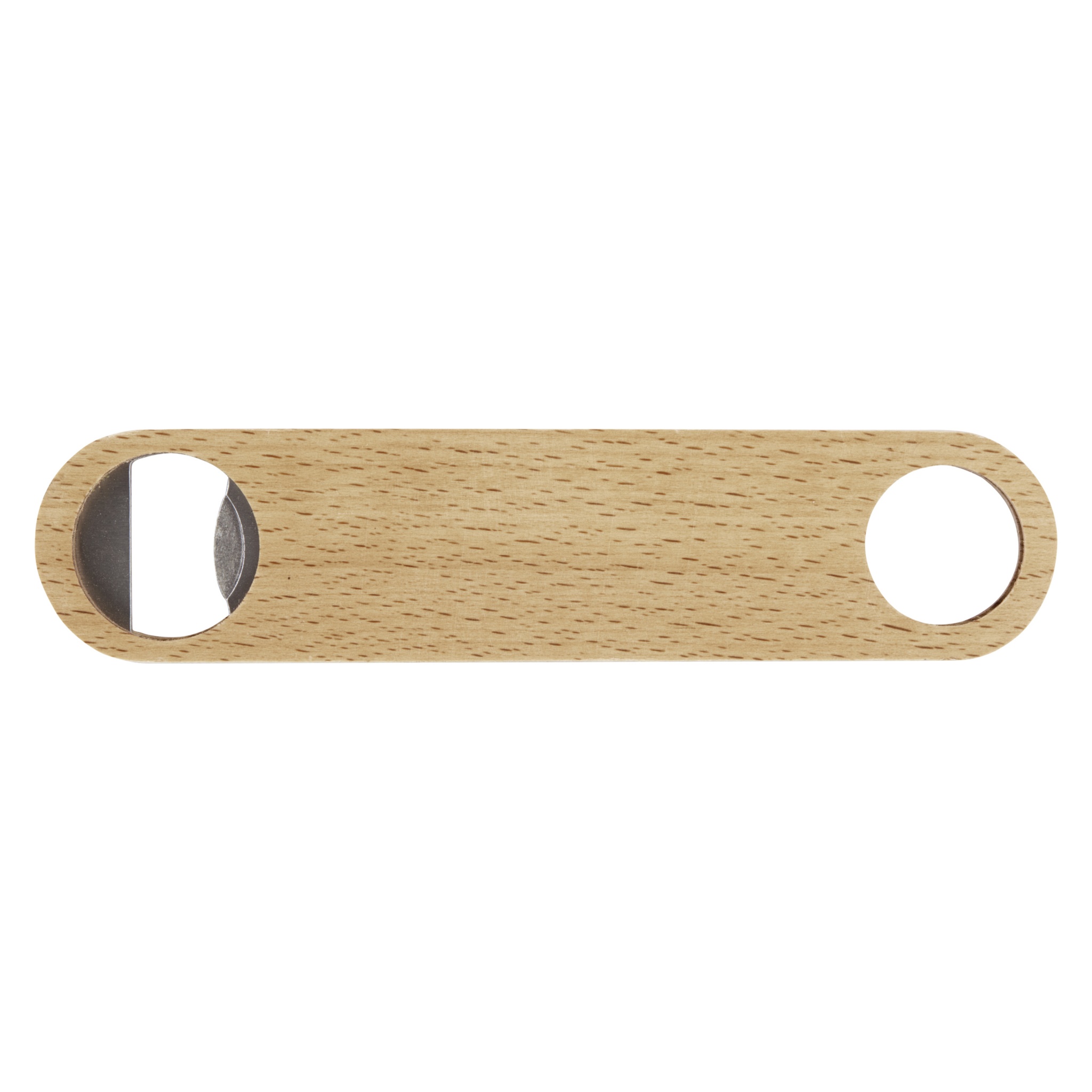 Puupintainen pullonavaaja ruostumattomasta teräksestä. Mahdollista ripustaa.