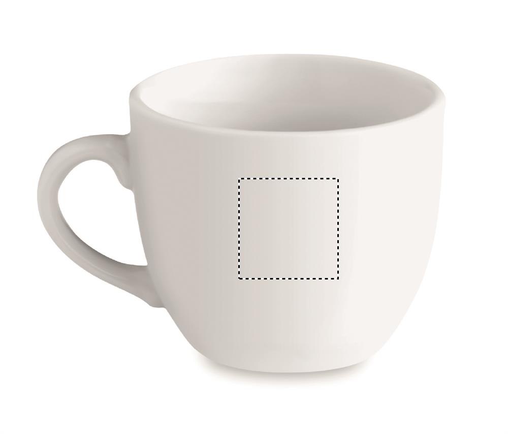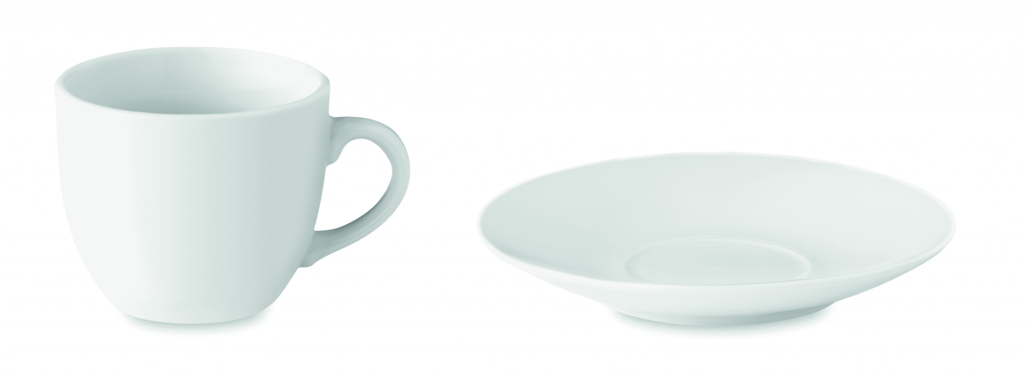 Posliininen 80 ml espressokuppi ja lautanen, bulkkipakkaus. Keraaminen siirtokuva on konepesun kestävä, tampopainatus vain käsinpesun.