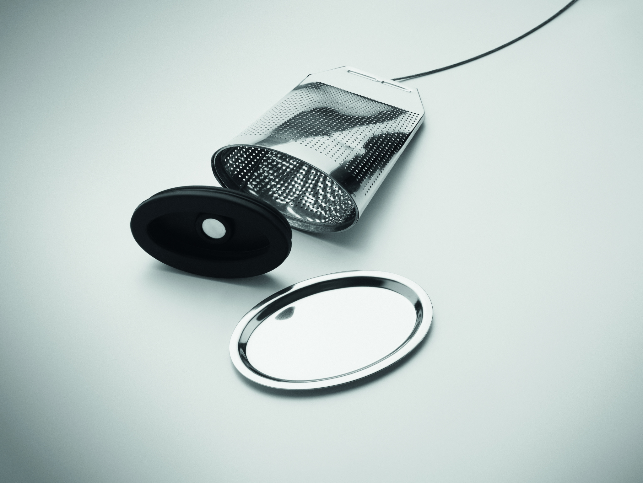 Ruostumattomasta teräksestä valmistettu irtoteehaudutin teepussin muodossa lautasella. Suuri teesiivilä silikonikahvalla.