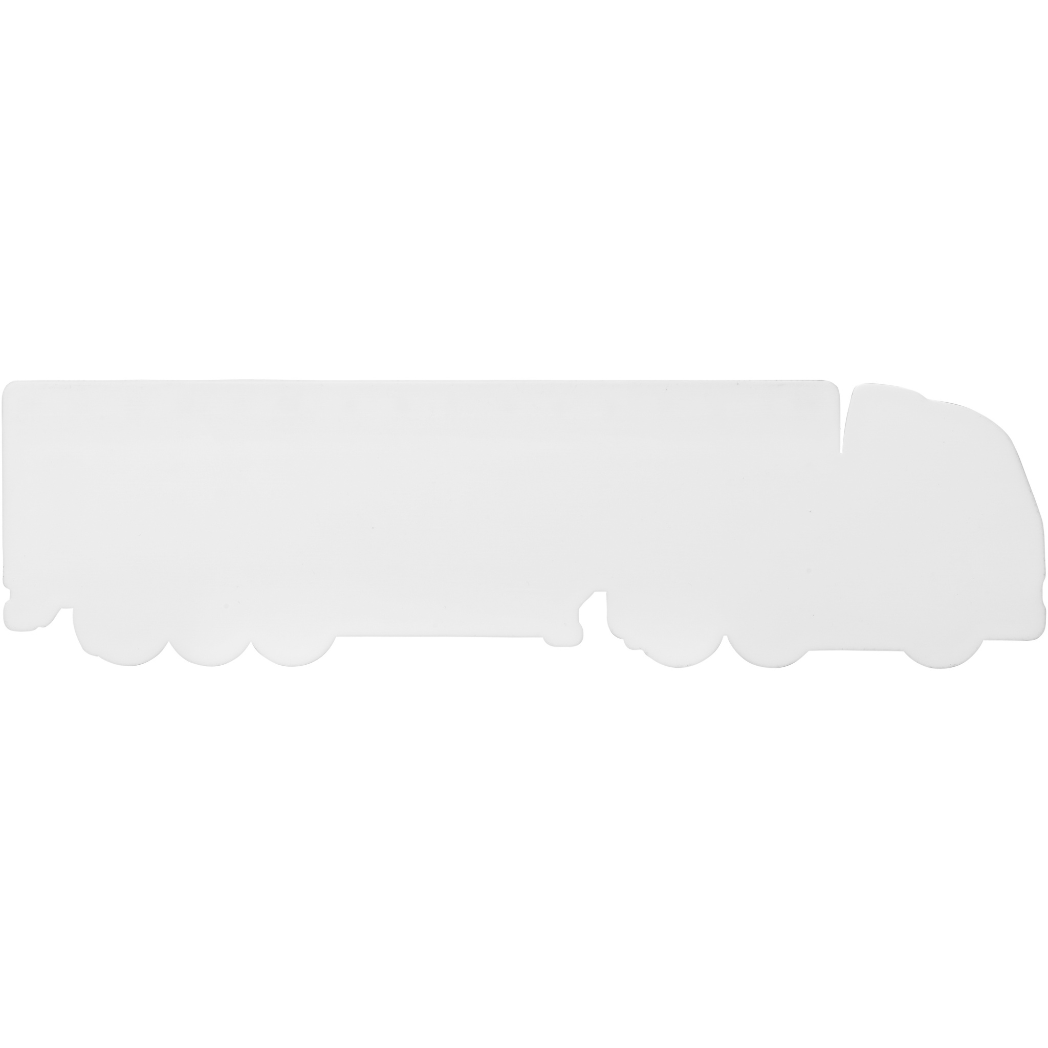 Kuorma-auton muotoinen tukeva muovinen viivain, johon on merkitty tuumat ja senttimetrit.