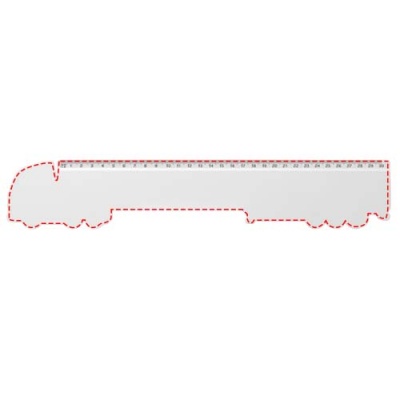 Kuorma-auton muotoinen kiinteä kierrätysmuoviviivain, jossa merkinnät tuumina tai senttimetreinä.