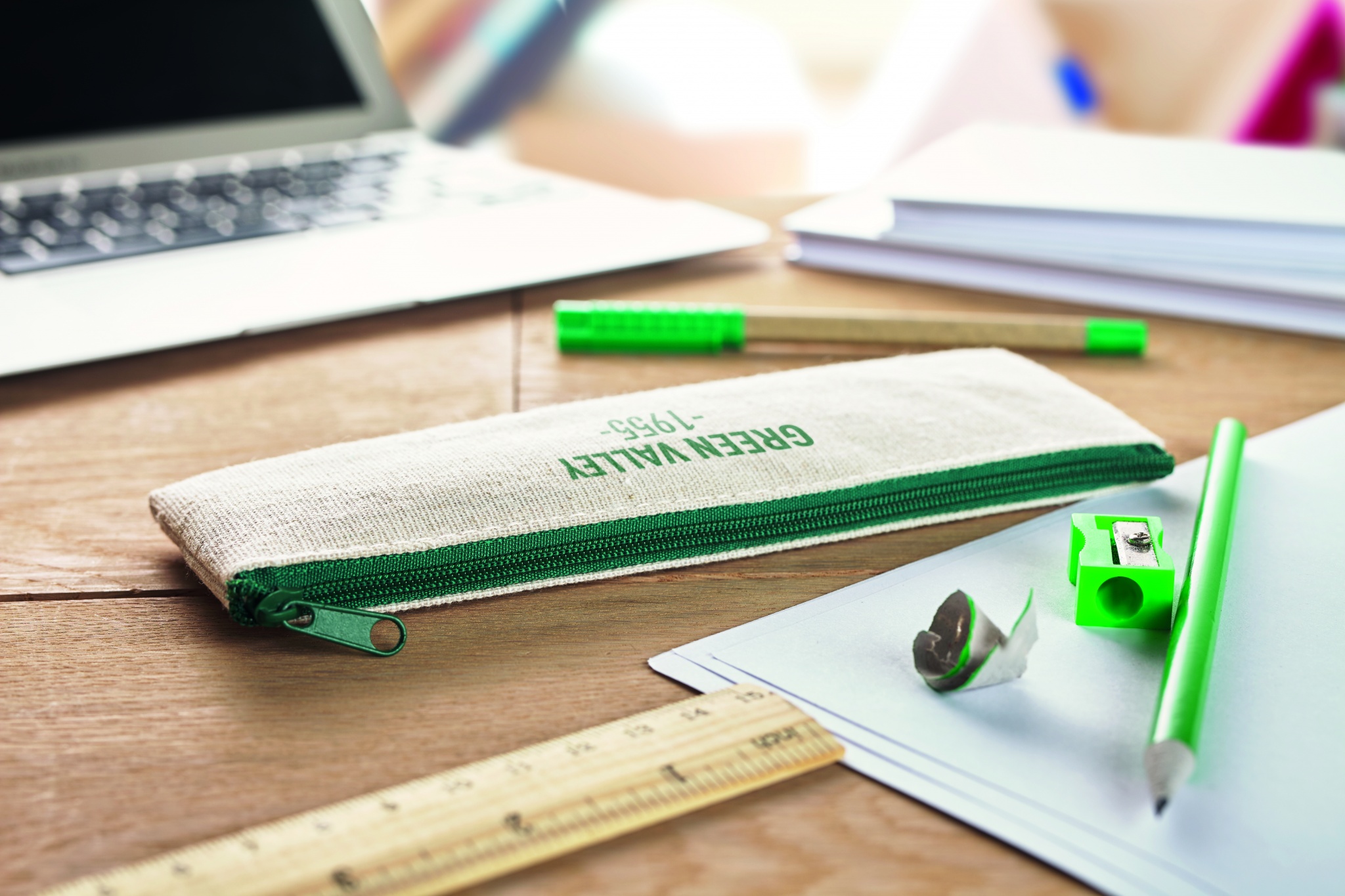 6 gabalu stacionārs komplekts. Iekļauts džutas un kokvilnas futrālis, koka lineāls, plastmasas asināmais, dzēšgumija, papīra zīmulis un lodīšu pildspalva ar zilu tinti.