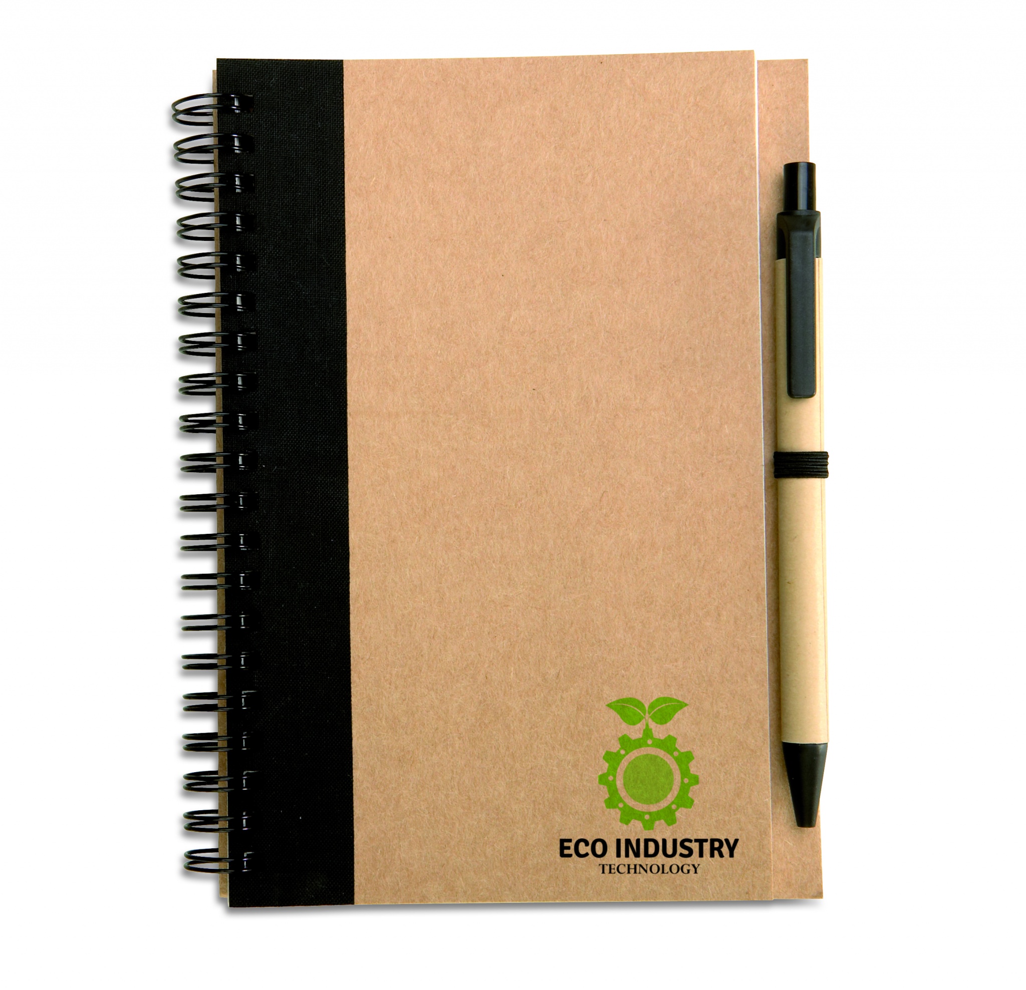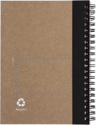 Блокнот из переработанной бумаги с ручкой в цвет. 140 страниц нелинованной переработанной бумаги (70 листов). Нажимная шариковая ручка из переработанного картона и биоразлагаемого пластика. Синие чернила. Эластичный держатель для ручки в цвет.