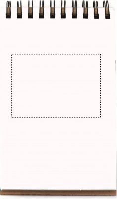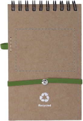 Блокнот из переработанной бумаги с ручкой в цвет. 140 страниц нелинованной переработанной бумаги (70 листов). Нажимная шариковая ручка из переработанного картона и биоразлагаемого пластика. Синие чернила. Эластичный ремешок и держатель для ручки.