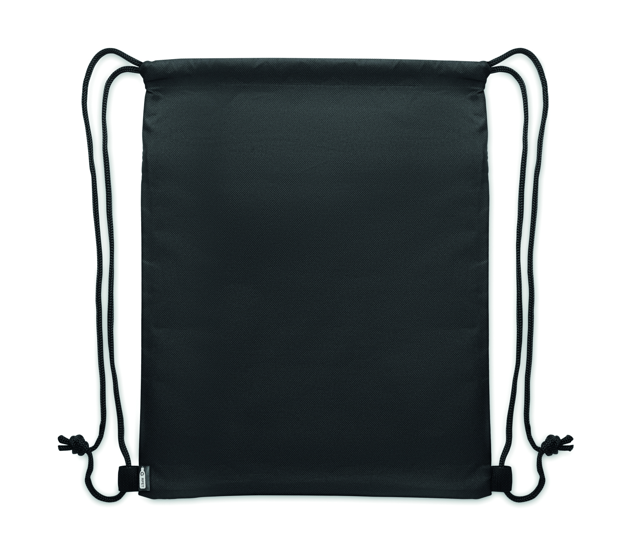 Drawstring bag with PU coated 600D RPET polyester and 190T RPET polyester lining. Zippered front pocket.