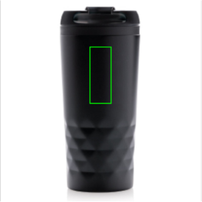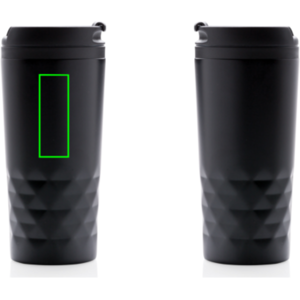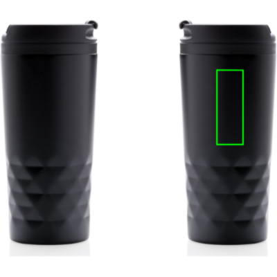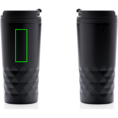 Модный стакан из нержавеющей стали с геометрическими деталями. Внутренний корпус изготовлен из пластика. Мыть только вручную. Объем 300 мл.