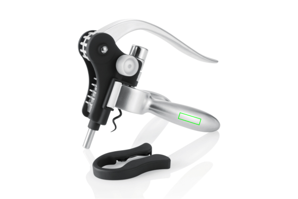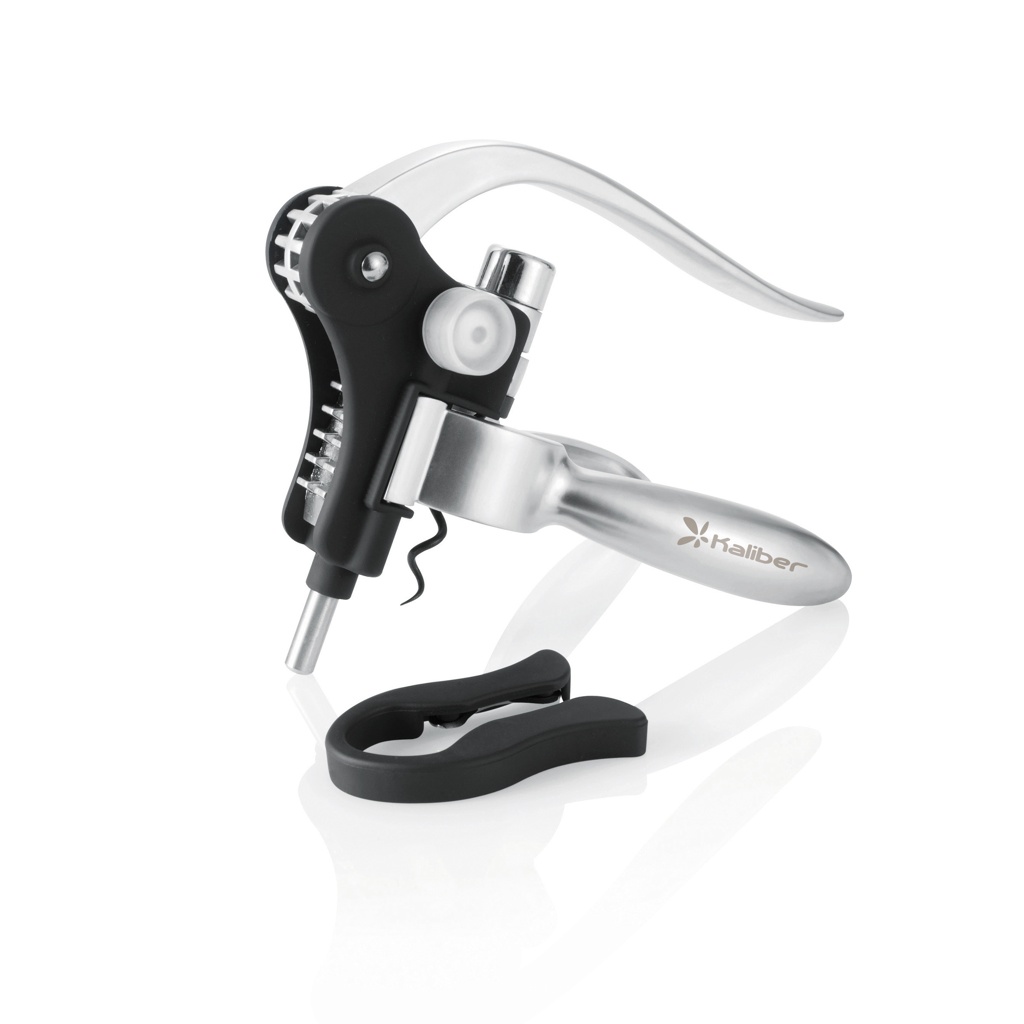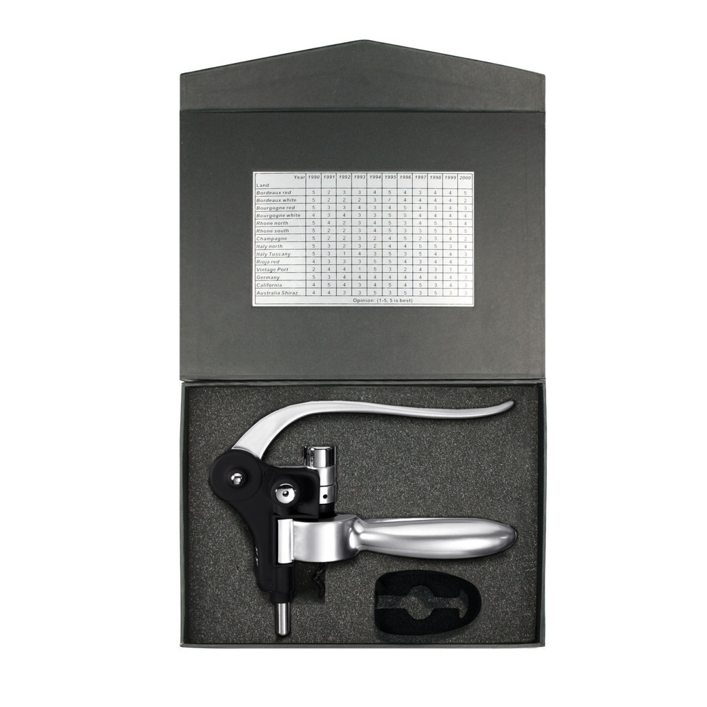 Штопор с рычажным механизмом из алюминия, закаленной стали и спиралью с тефлоновым покрытием, в комплект входит резак для фольги и табличка с обзором лучших винодельческих регионов по состоянию на 1990 год.