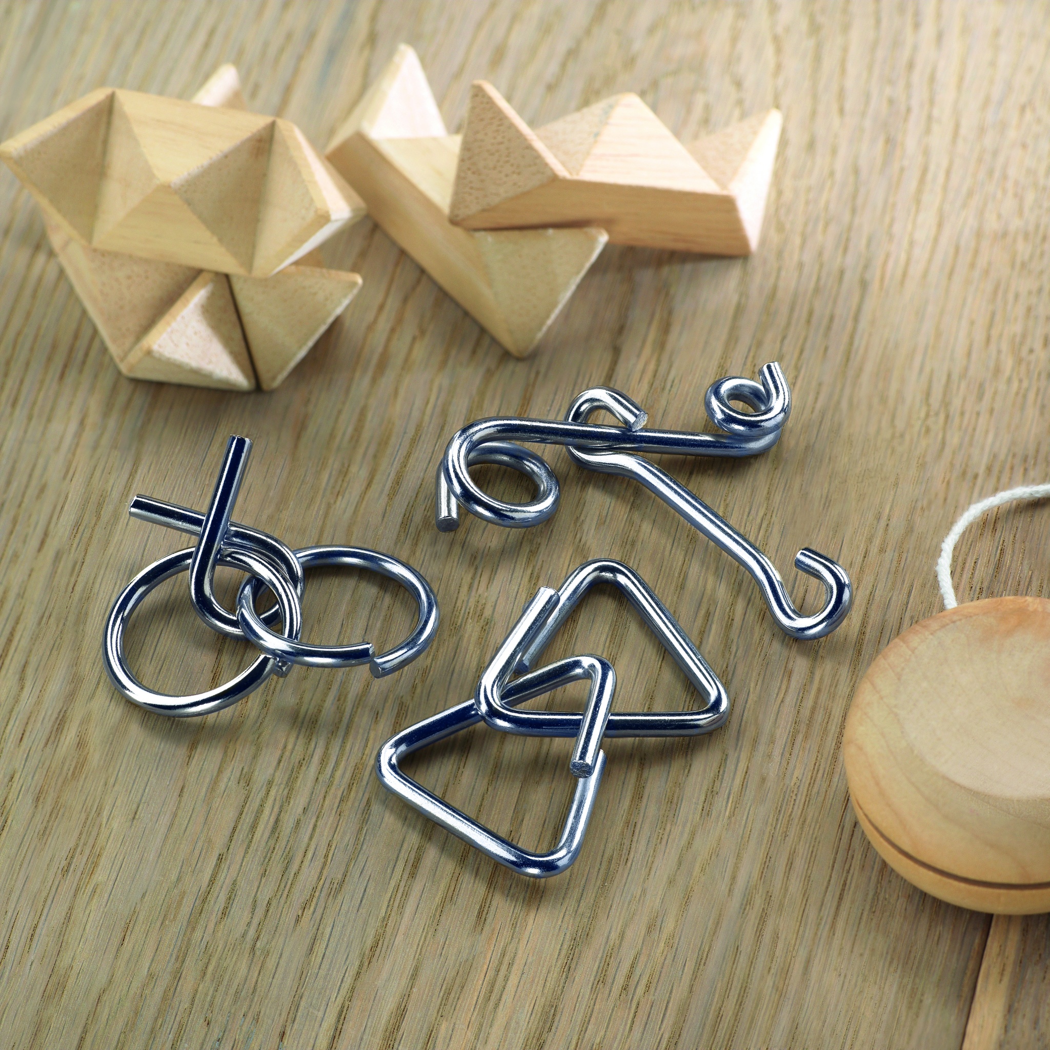 Набор из трех металлических головоломок, упакованных в хлопковый мешочек.
