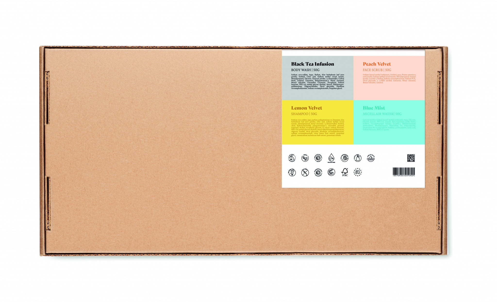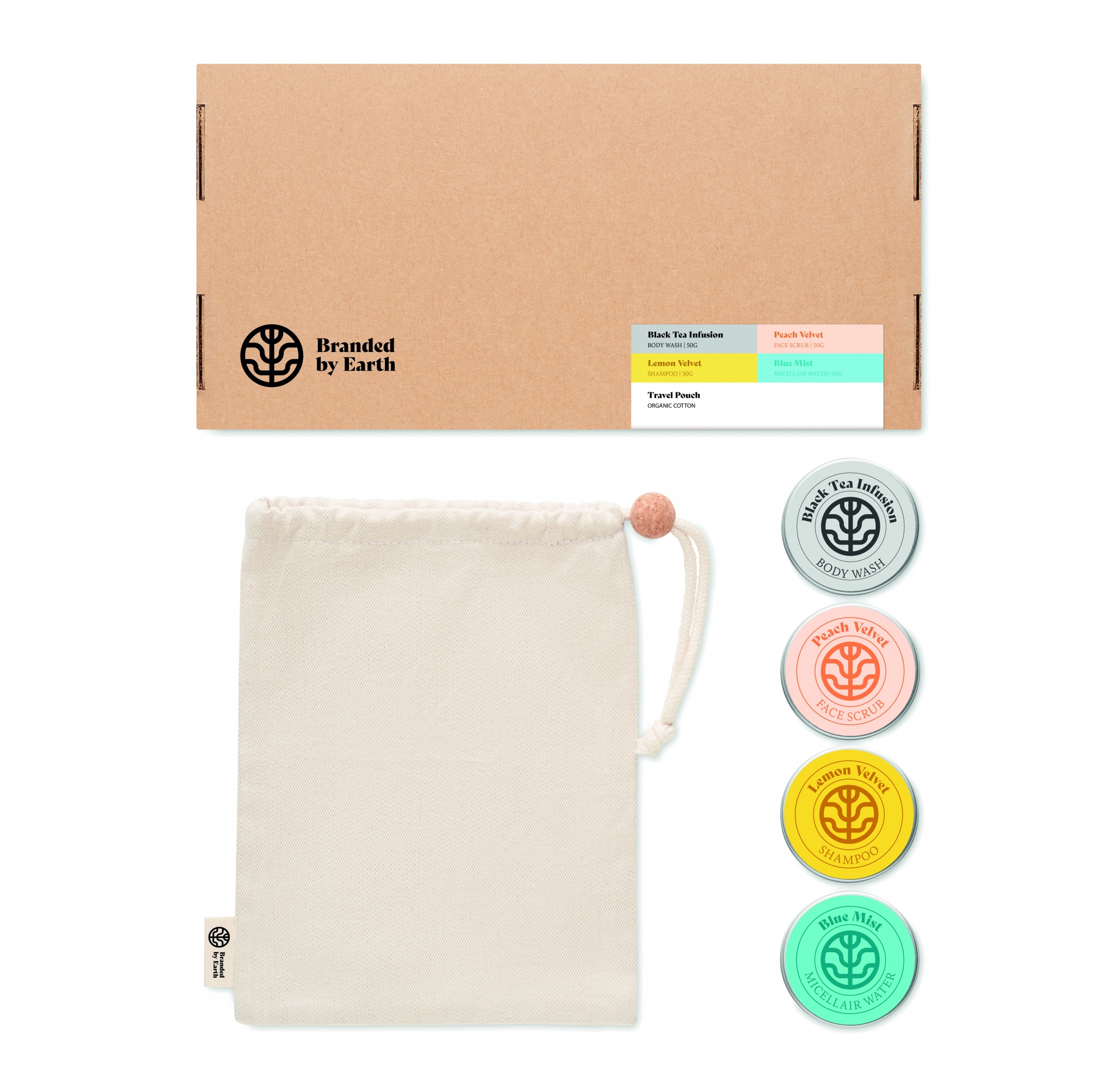 Подарочный дорожный набор для ухода унисекс от Branded By Earth. Включает растительное средство для мытья тела (50 гр), шампунь, скраб для лица, мицеллярную воду и дорожный мешочек из органического хлопка. Все средства завернуты в бумагу. Поставляется в коробке из переработанной бумаги. Сделано в ЕС.